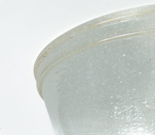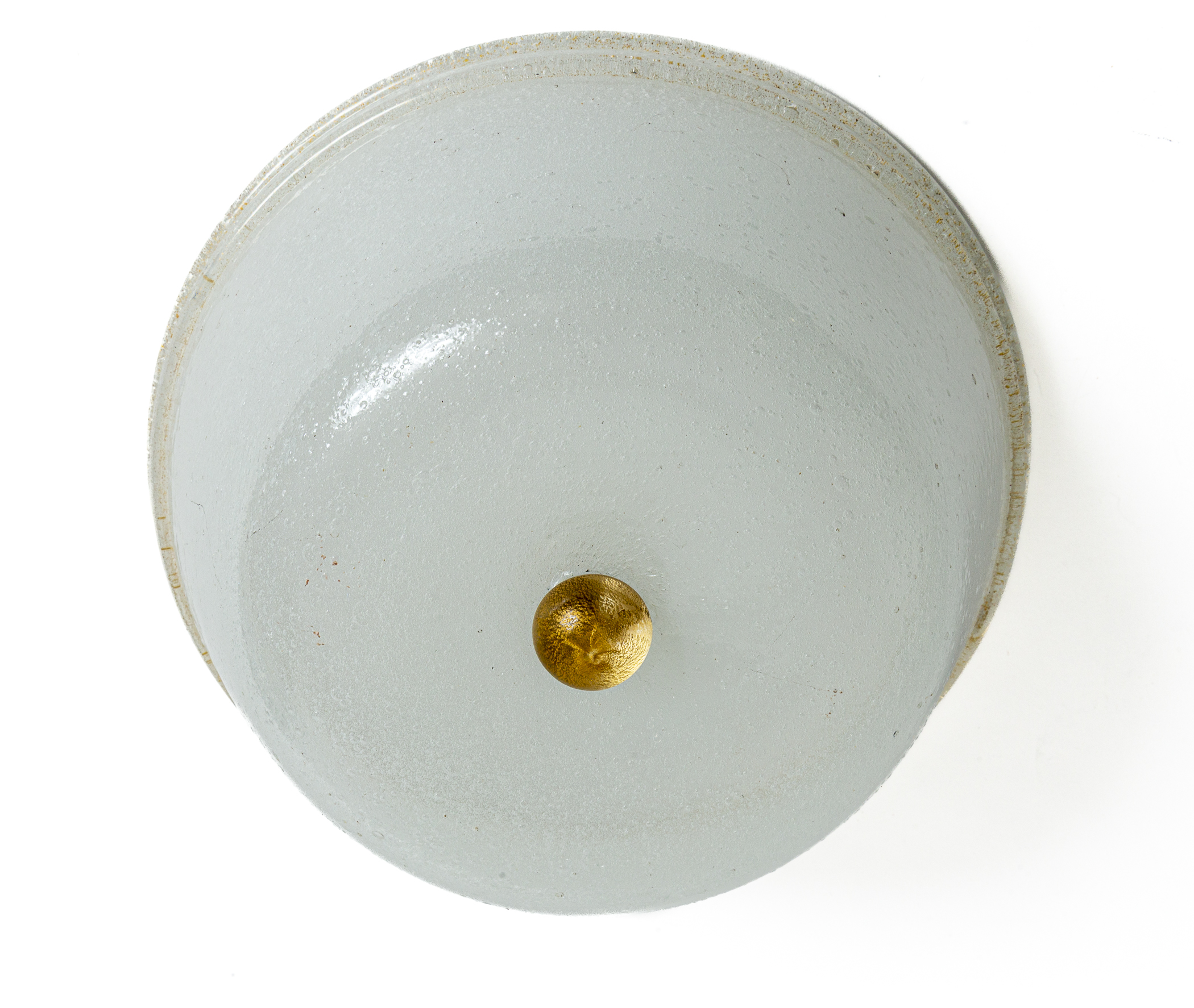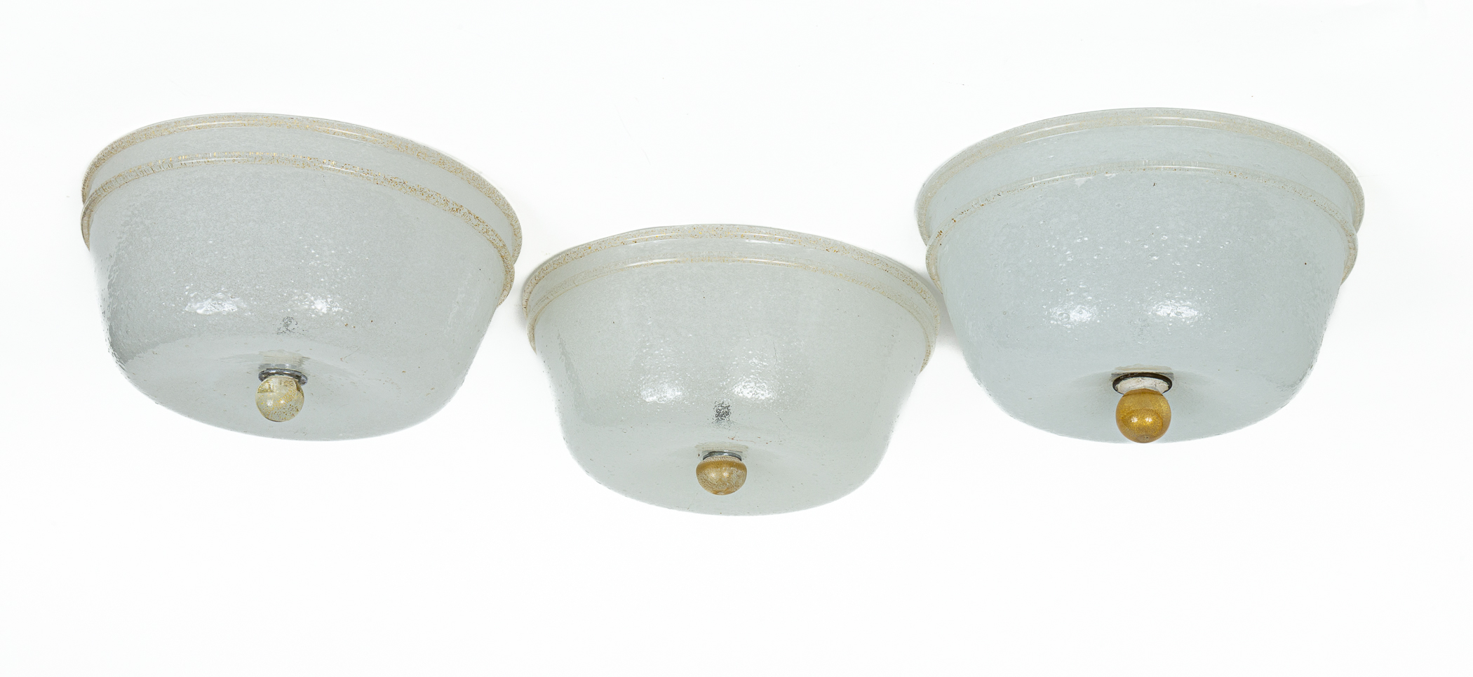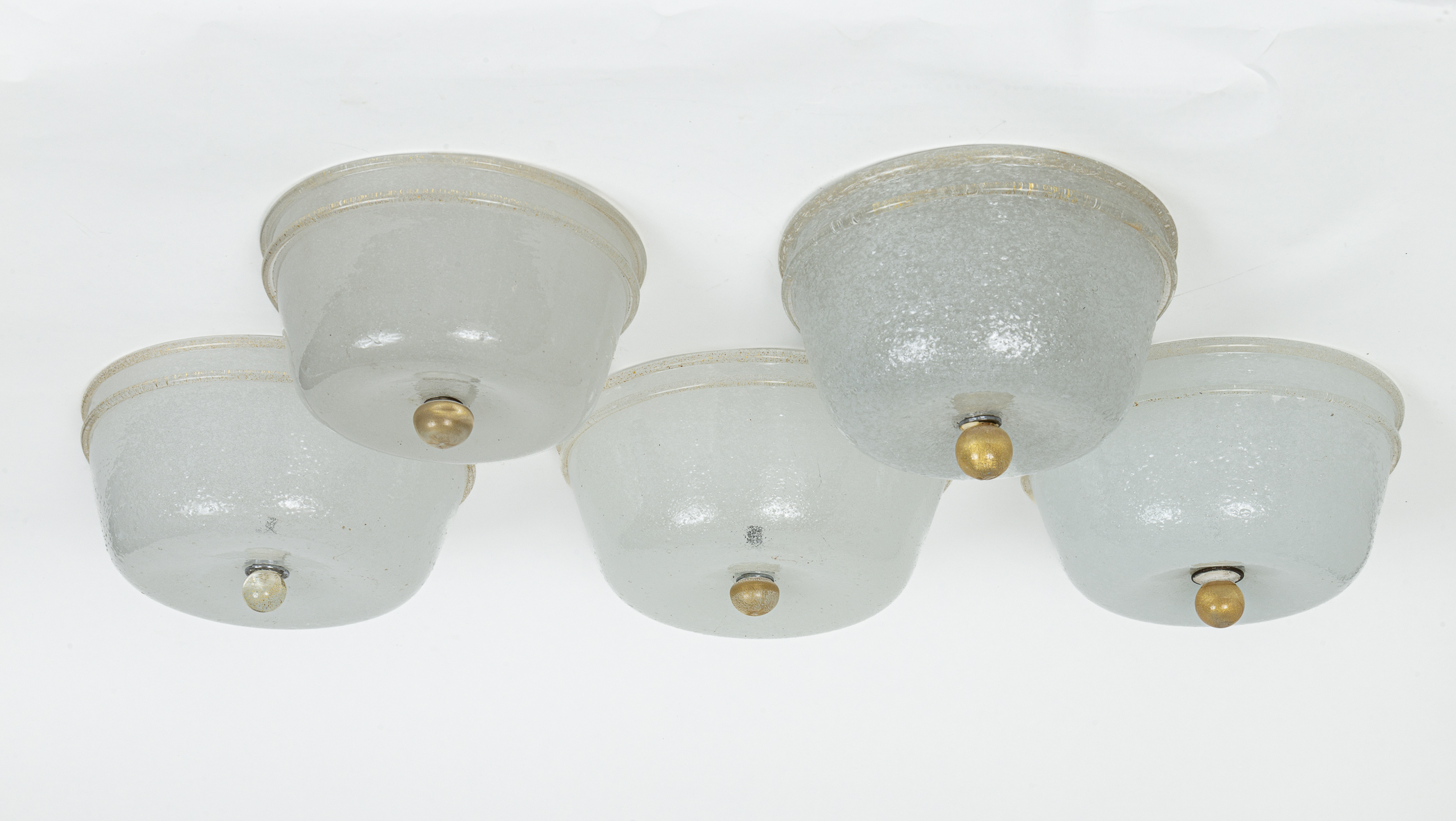 A charming series of five vintage Italian glass opaque white flush mounts of varying sizes, blown in the pulegoso technique (a technique of blowing that forms the glass with controlled bubbles creating a very soft and shimmery illumination effect). Its tapered angular shape is typical form of the 1940’s. Additionally each fixture carries ever so slight gold blown trim and ball finials. The finials all vary as well.