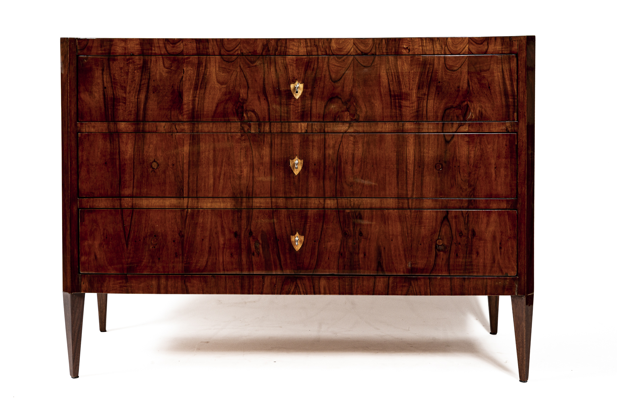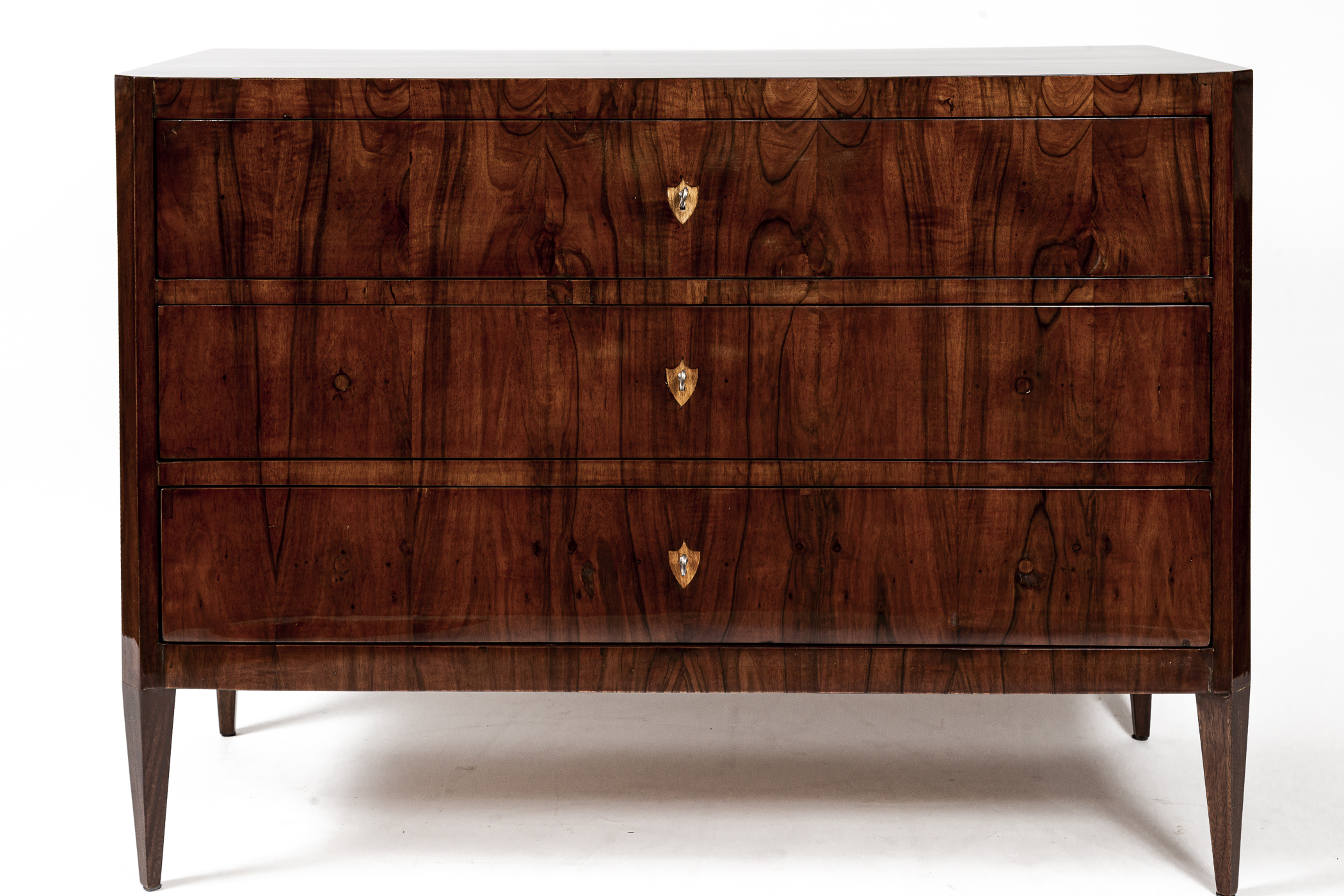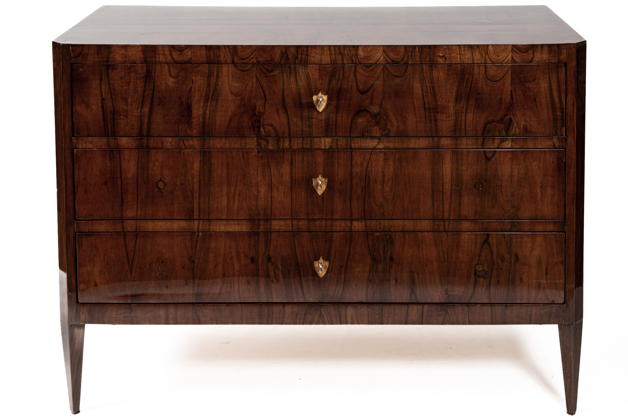 This stunning Biedermeier chamfered front chest displays exquisite book-matched dark walnut veneers that waterfall from its plateau down its three long drawers, finishing onto straight, tapered legs. Each drawer is accented with a shield-shaped inlaid escutcheon and opens with a key to reveal the original steel locks and pine secondary wood interiors.