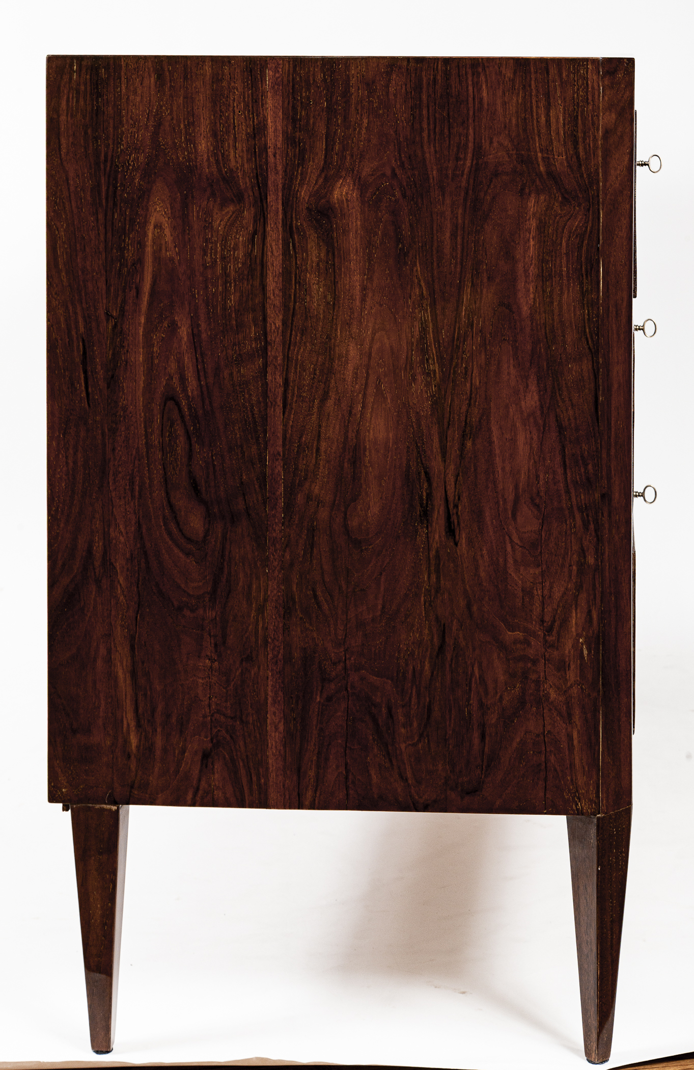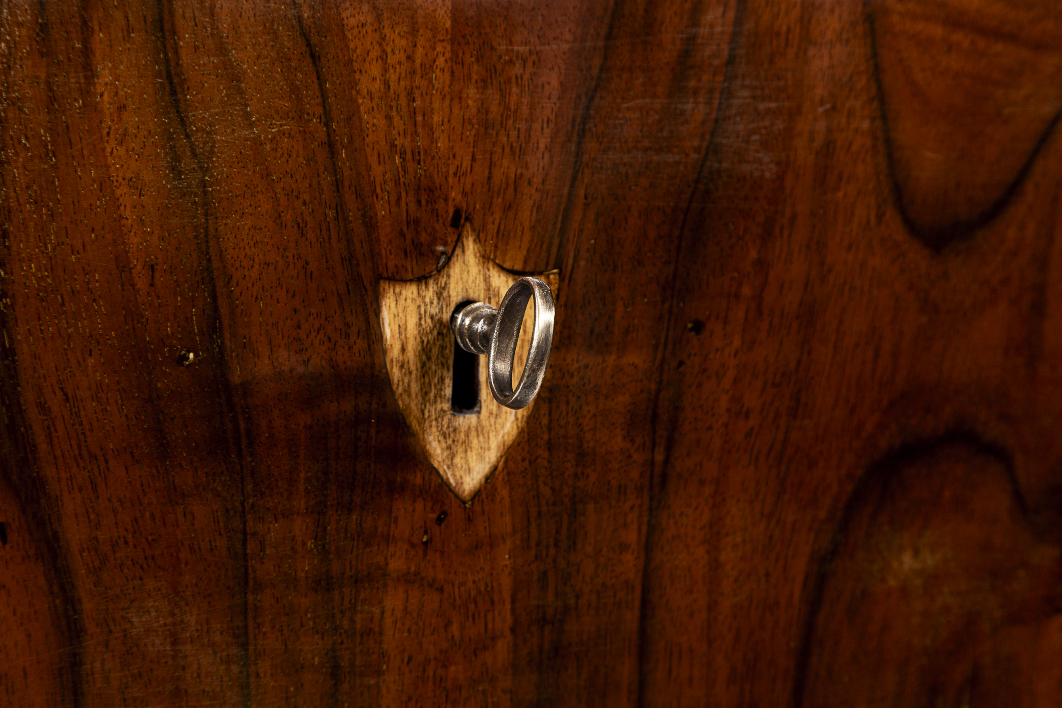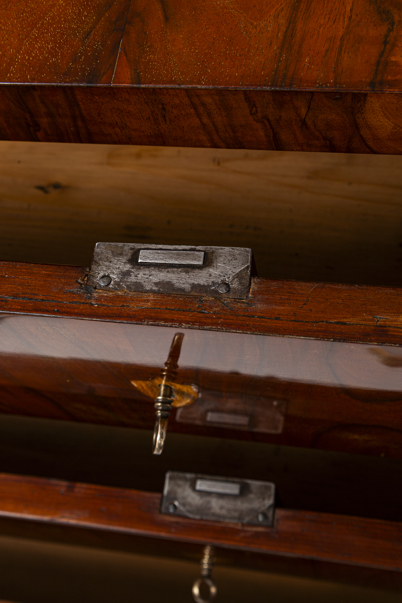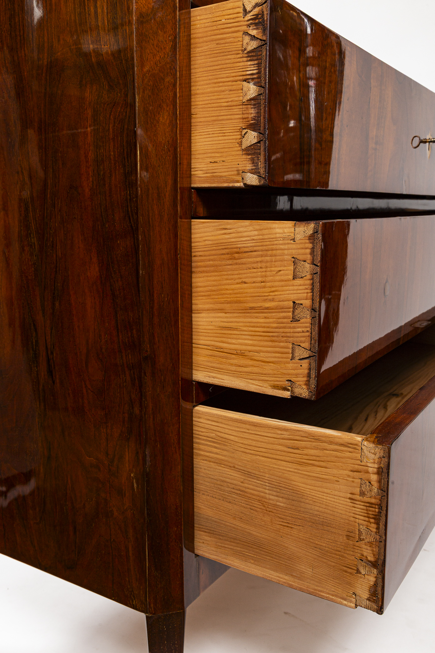 This stunning Biedermeier chamfered front chest displays exquisite book-matched dark walnut veneers that waterfall from its plateau down its three long drawers, finishing onto straight, tapered legs. Each drawer is accented with a shield-shaped inlaid escutcheon and opens with a key to reveal the original steel locks and pine secondary wood interiors.