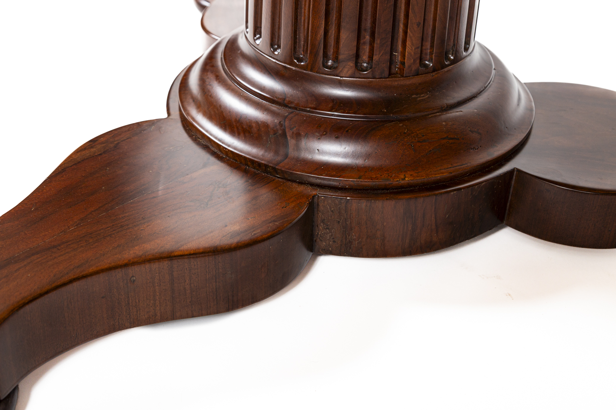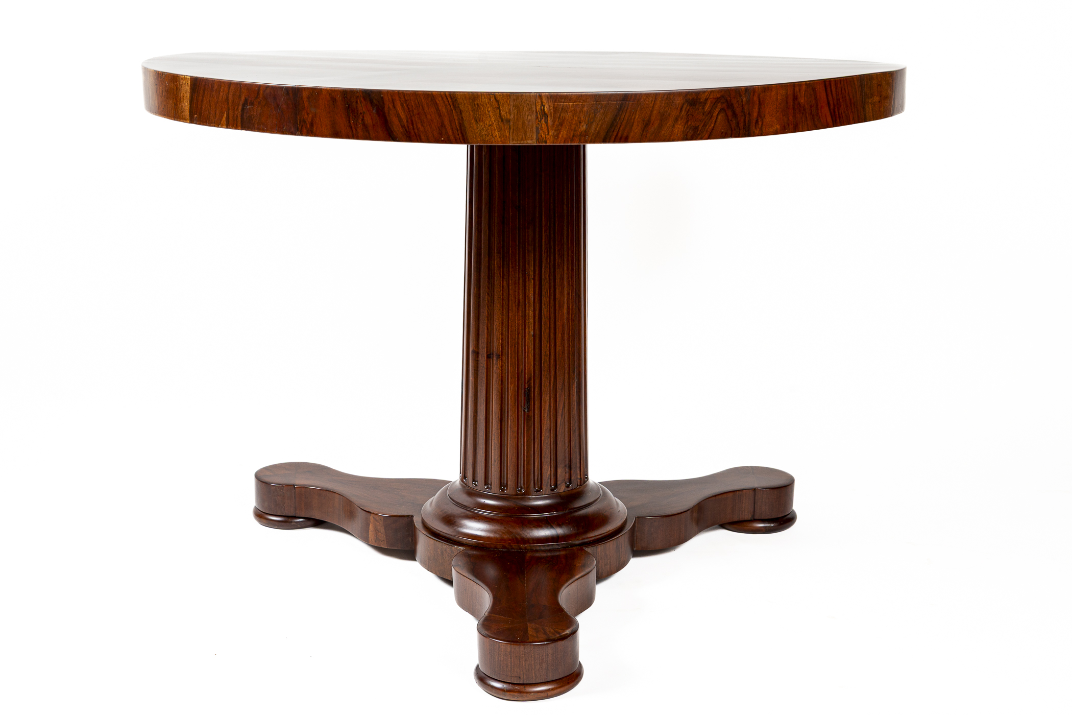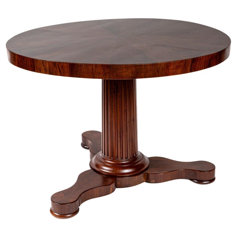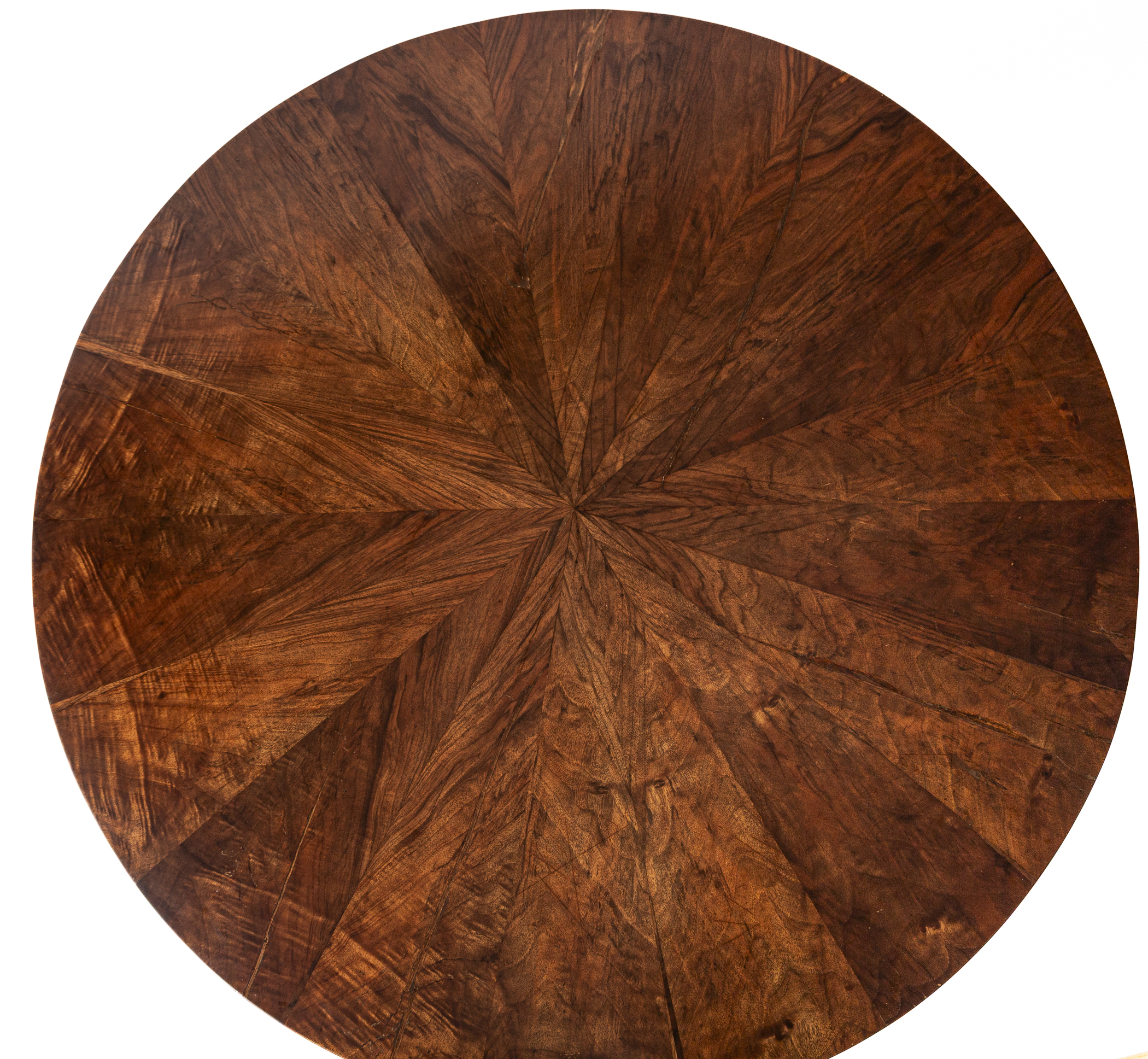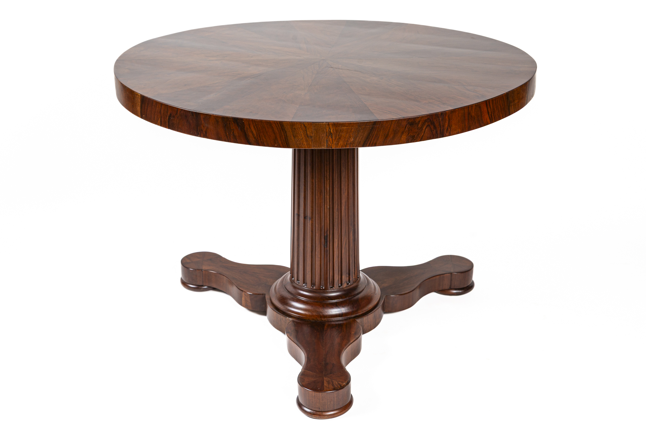 A very sleek and elegant Italian Neoclassical center table featuring a modernized circular plateau with striking pie-crust veneer work on a central fluted reeded column, finishing on a concave tripartite plinth with low-profile feet. Note the rich and dark walnut veneer and soft matte finish.