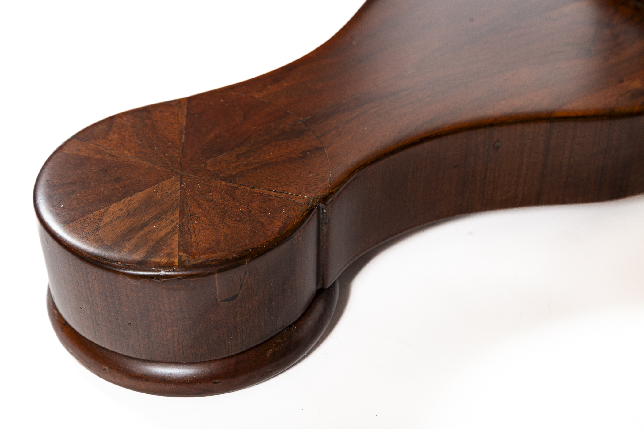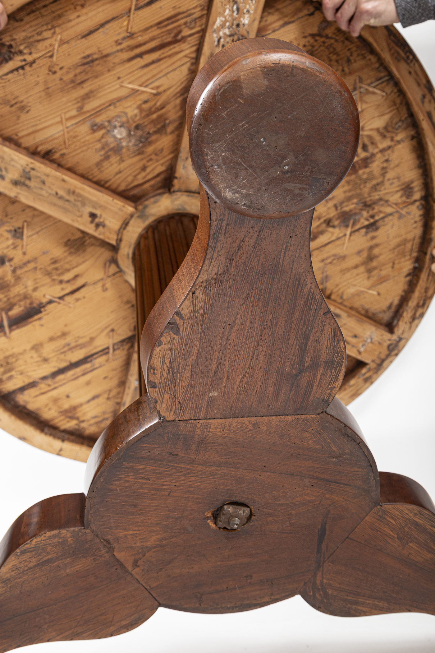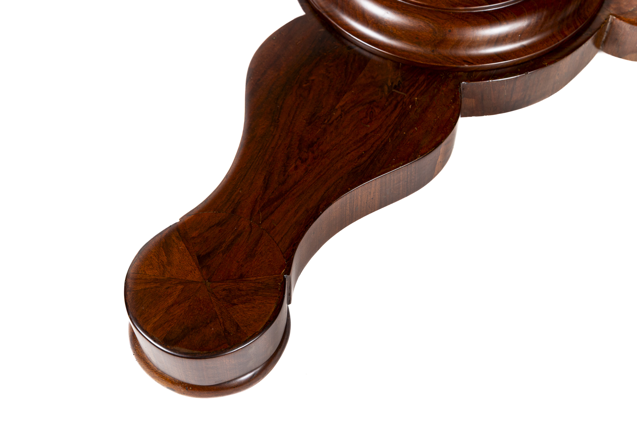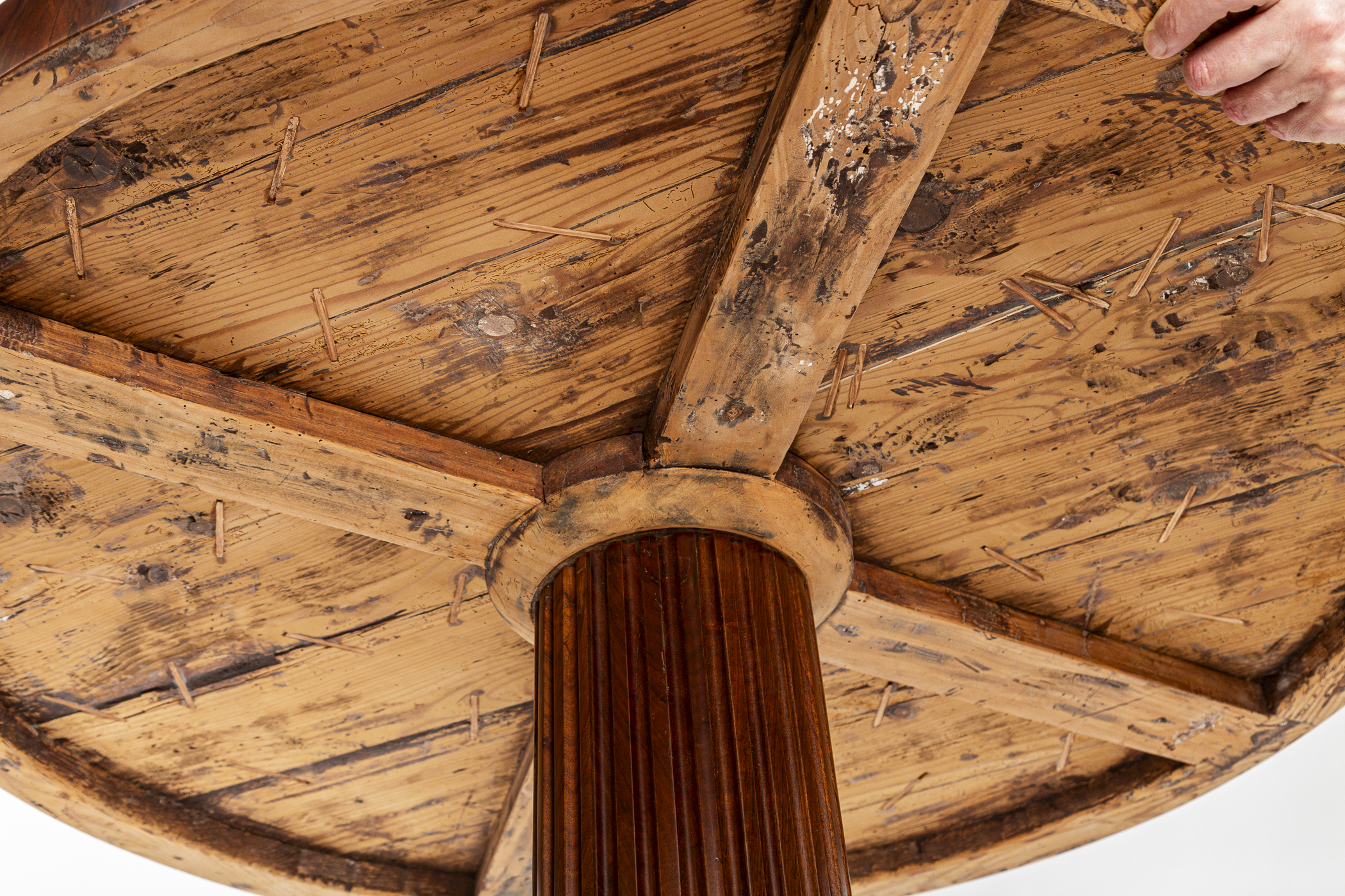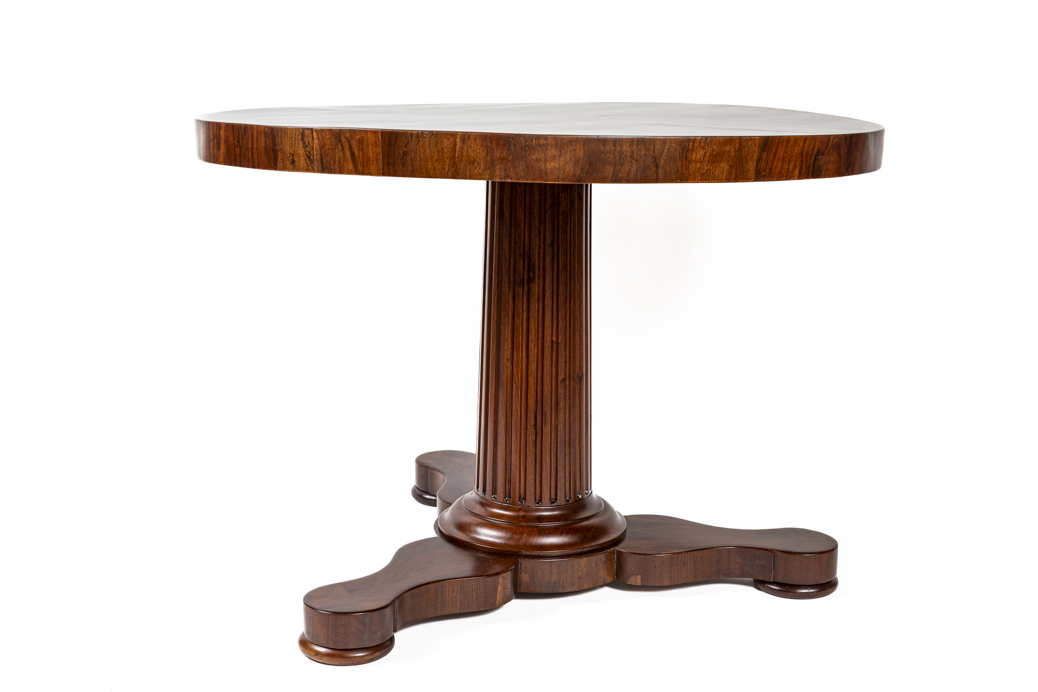 A very sleek and elegant Italian Neoclassical center table featuring a modernized circular plateau with striking pie-crust veneer work on a central fluted reeded column, finishing on a concave tripartite plinth with low-profile feet. Note the rich and dark walnut veneer and soft matte finish.