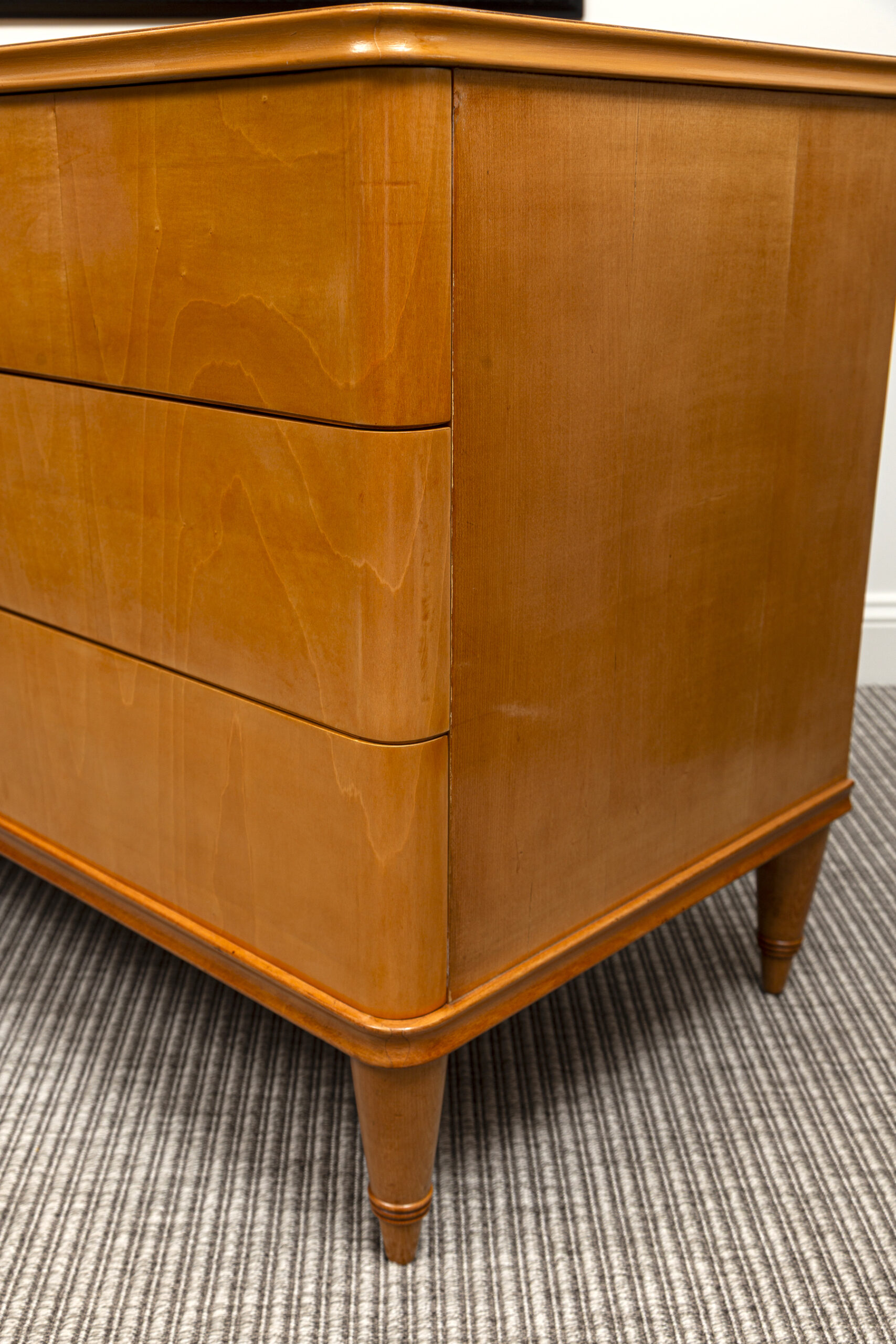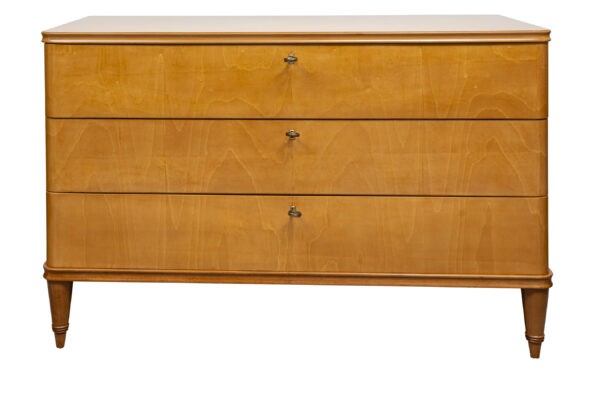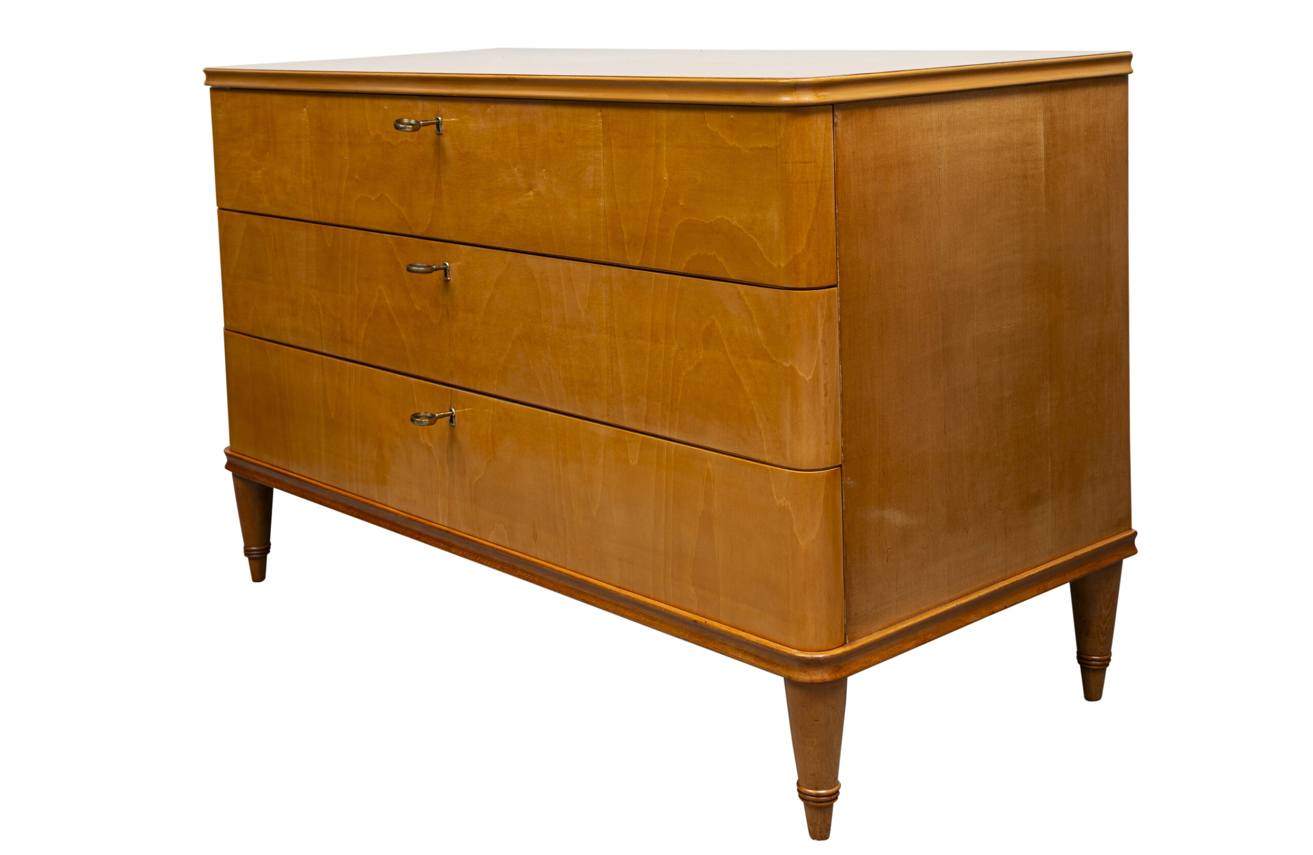 A sleek book-matched blonde maple wood chest composed of three long drawers rounding its corners and finishing on three pronounced short turned legs with double edge molding. Drawers adorned with brass escutcheons and open with its original brass keys.