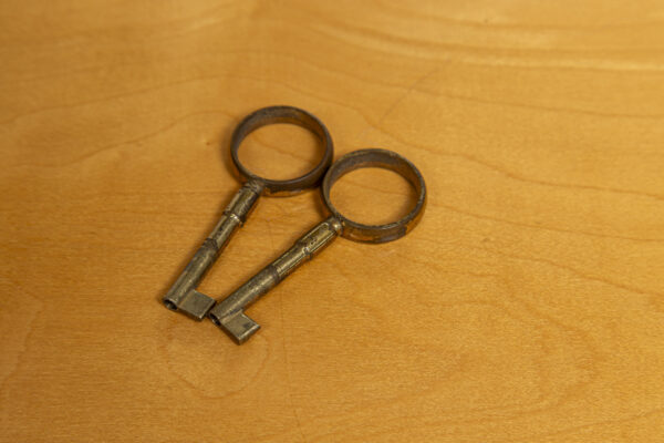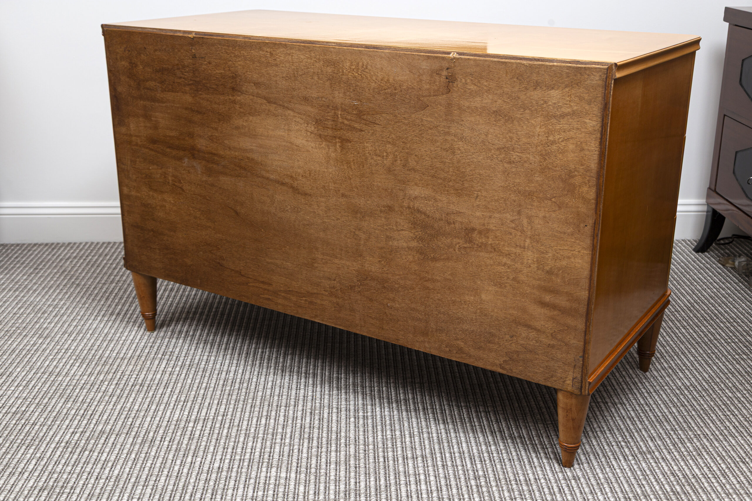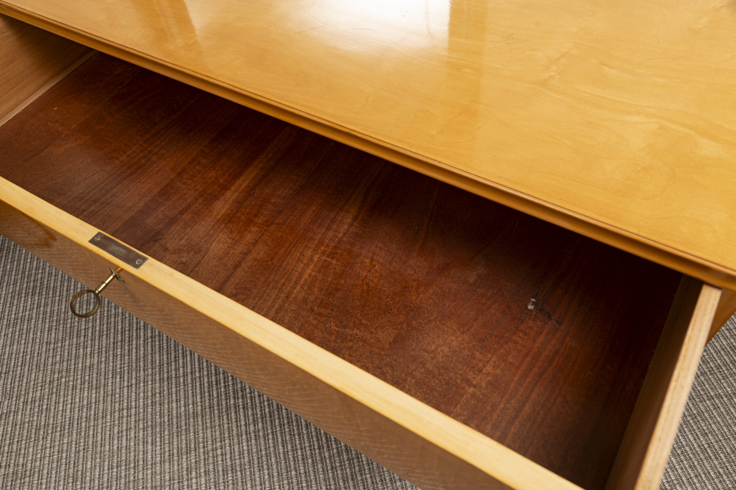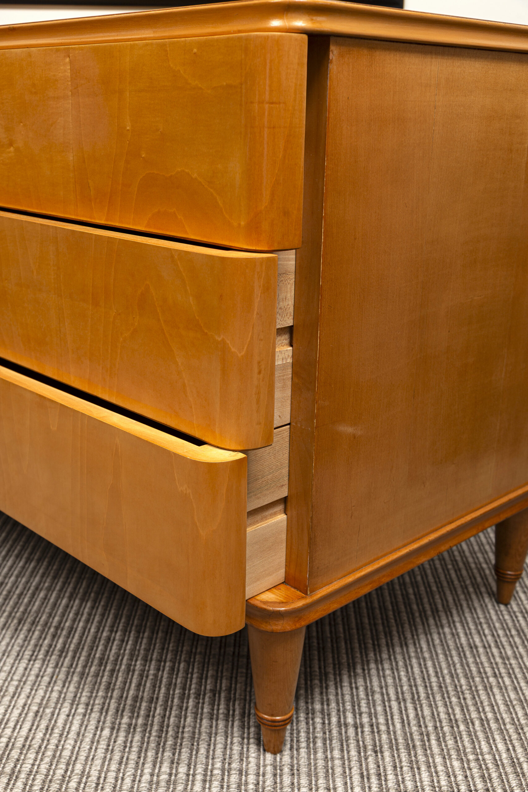 A sleek book-matched blonde maple wood chest composed of three long drawers rounding its corners and finishing on three pronounced short turned legs with double edge molding. Drawers adorned with brass escutcheons and open with its original brass keys.