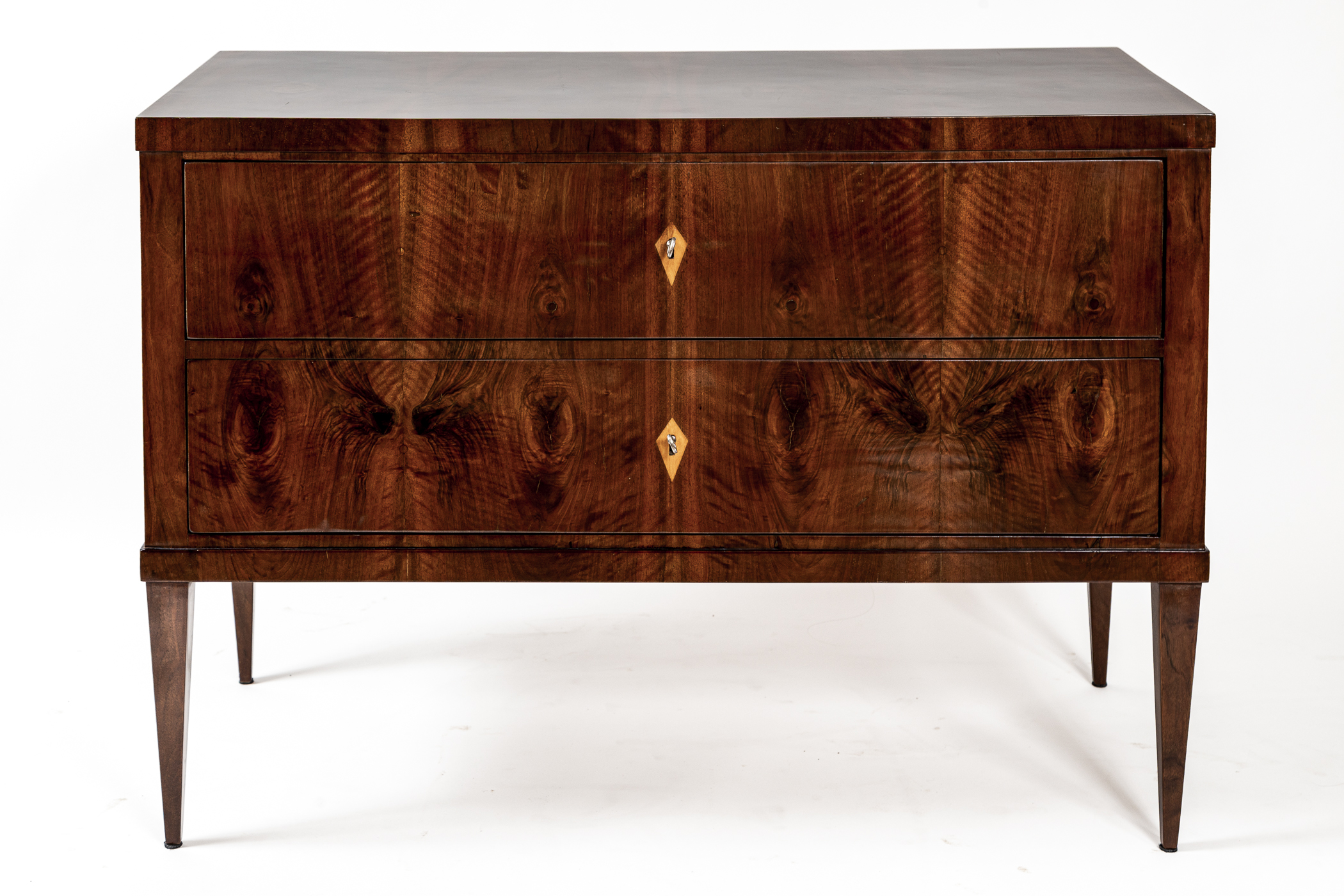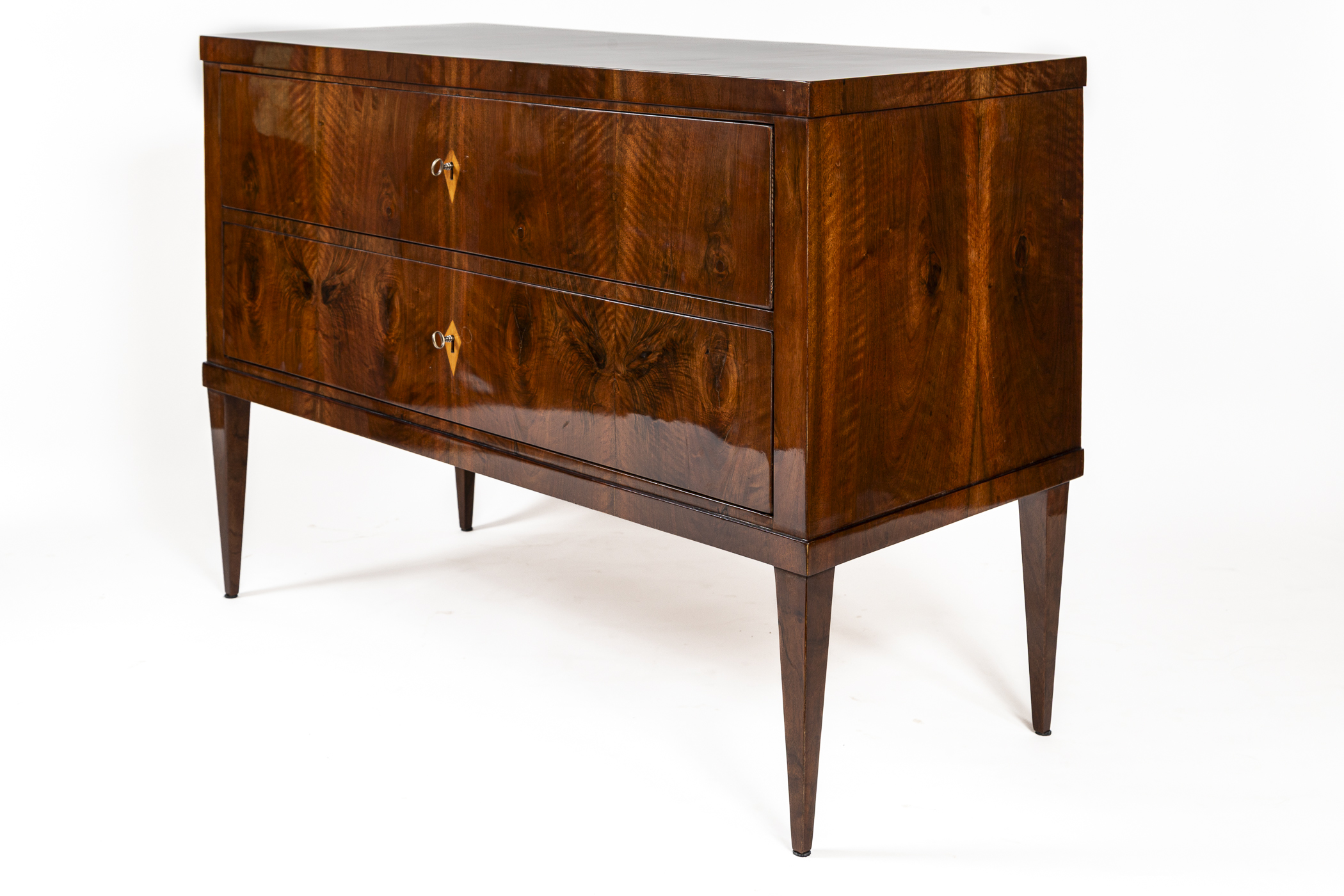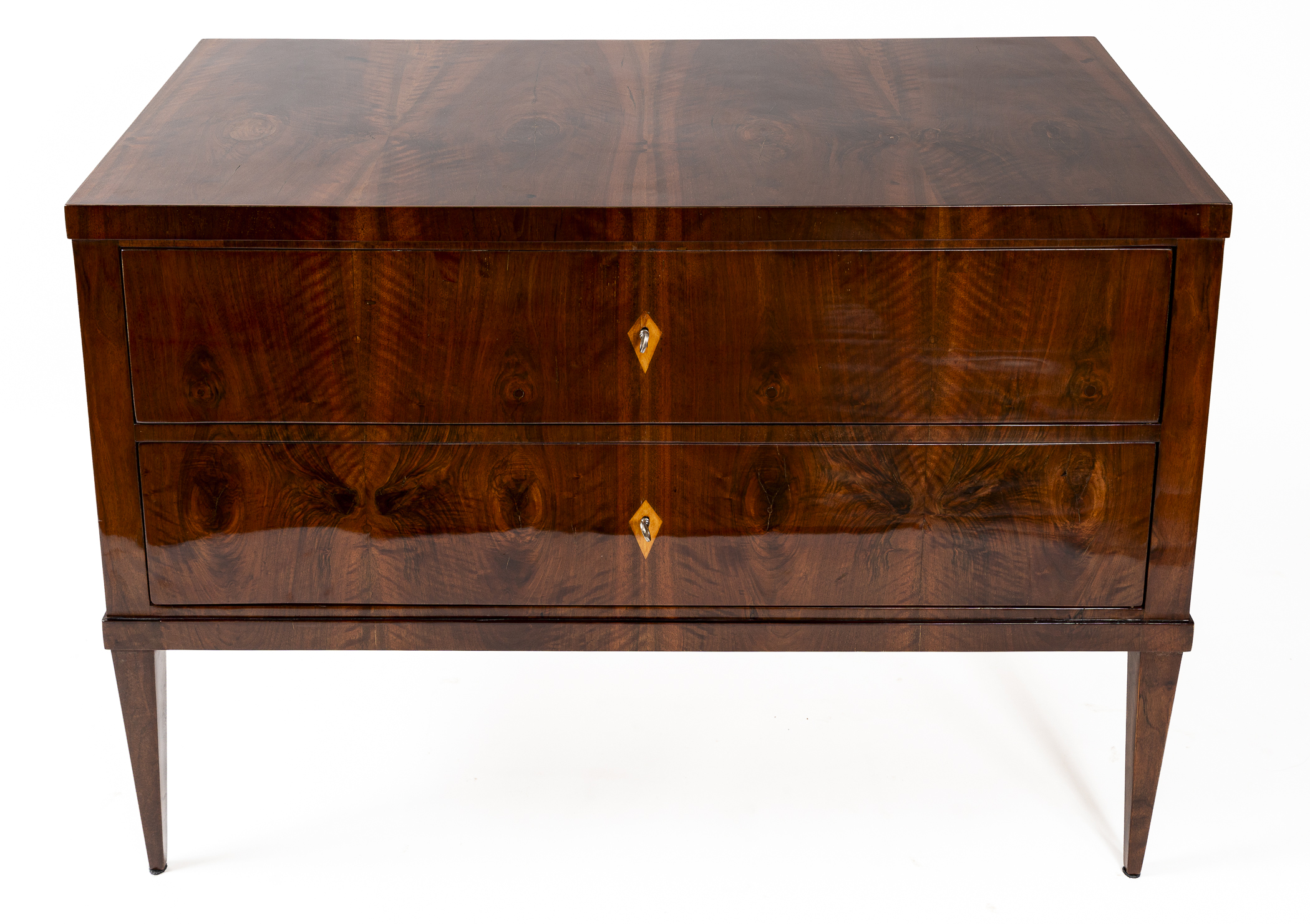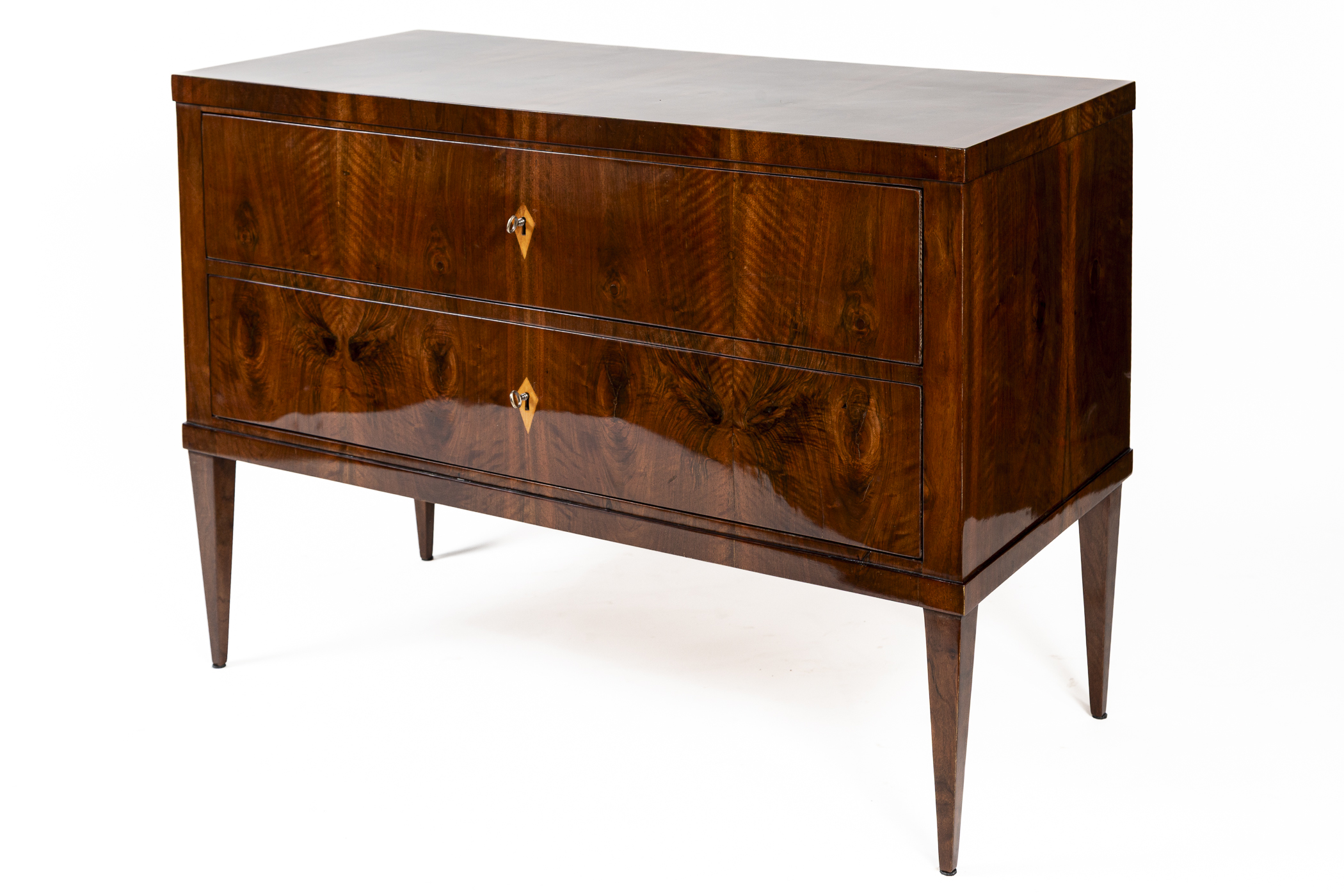 This sleek Biedermeier chest of drawers features clean lines and a modern edge plateau, beautifully finished in bookmatched dark walnut veneer. The two deep drawers are set atop elegant, high-tapered legs. Maintaining a minimalist aesthetic, the piece is simply adorned with diamond-shaped inlaid escutcheons.