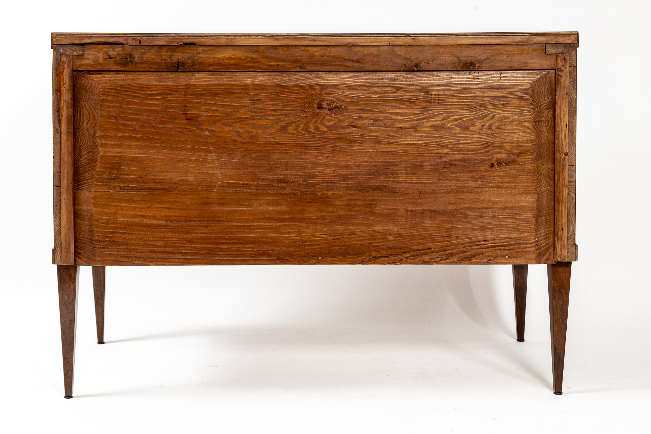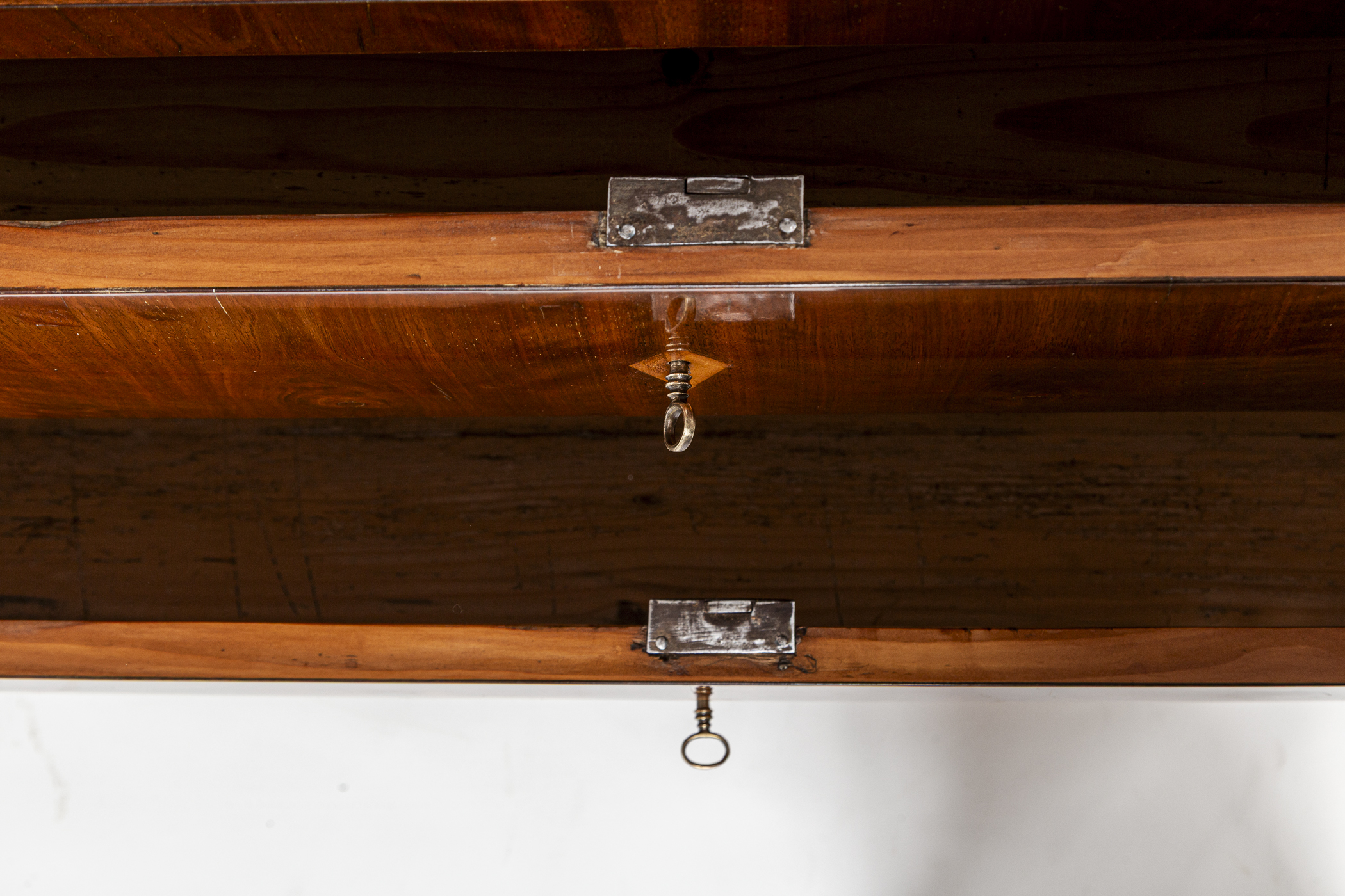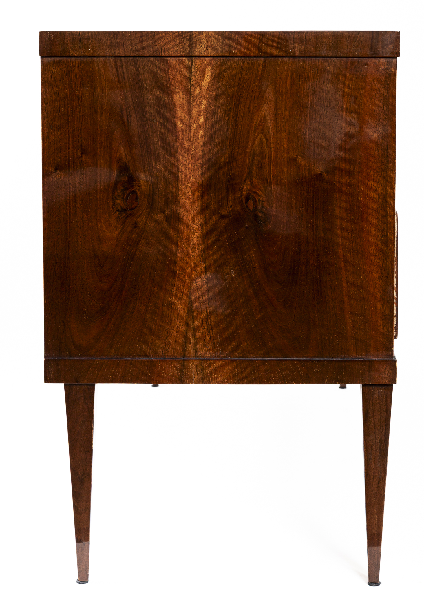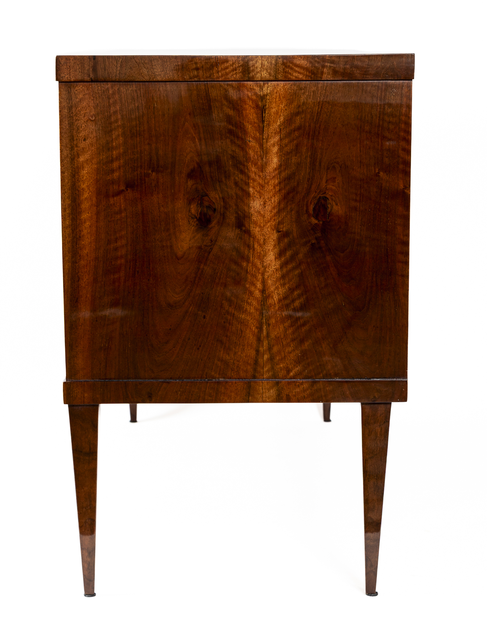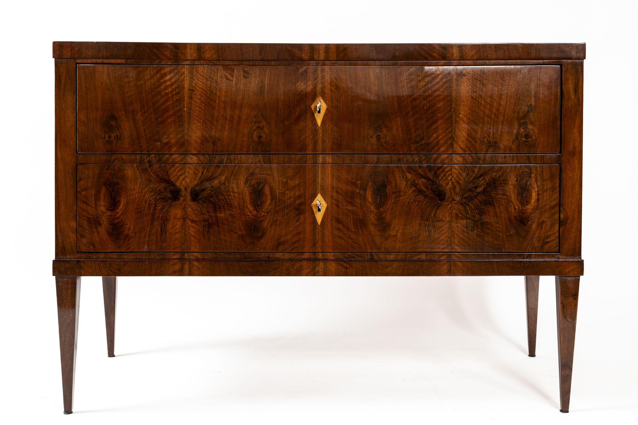 This sleek Biedermeier chest of drawers features clean lines and a modern edge plateau, beautifully finished in bookmatched dark walnut veneer. The two deep drawers are set atop elegant, high-tapered legs. Maintaining a minimalist aesthetic, the piece is simply adorned with diamond-shaped inlaid escutcheons.