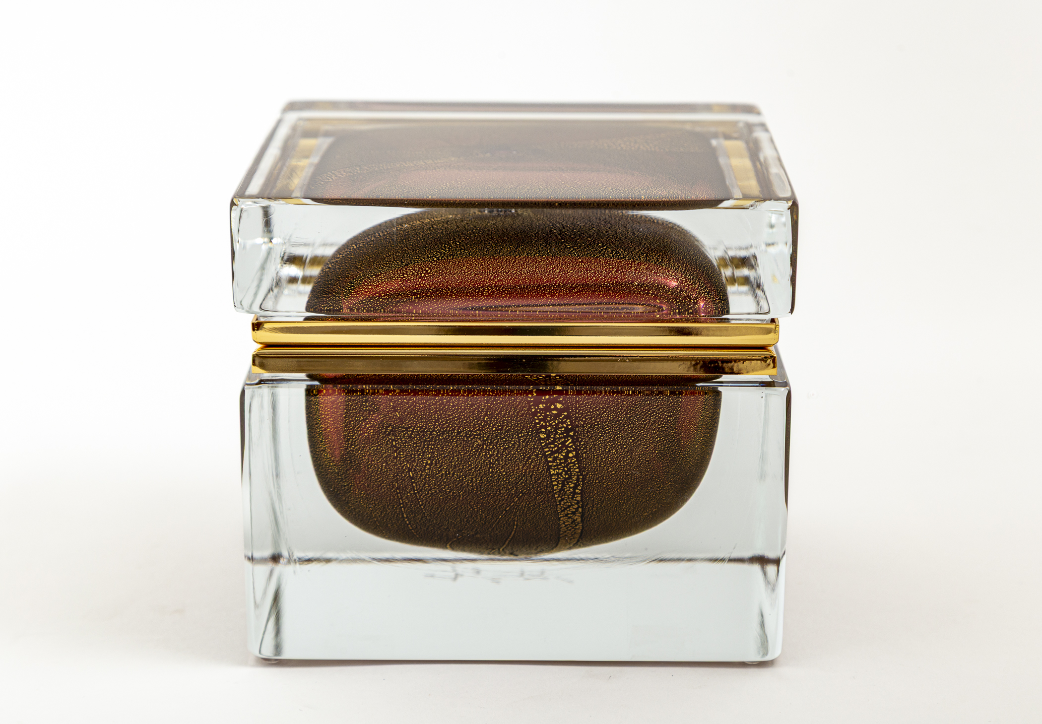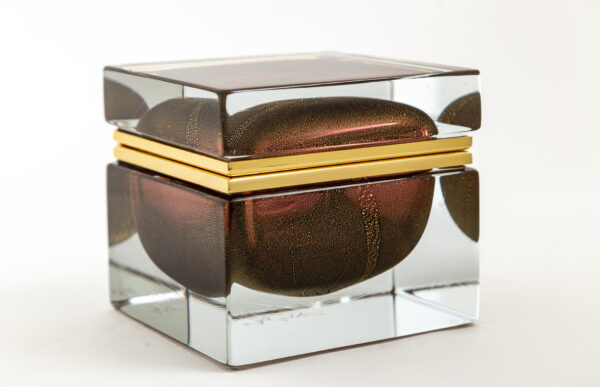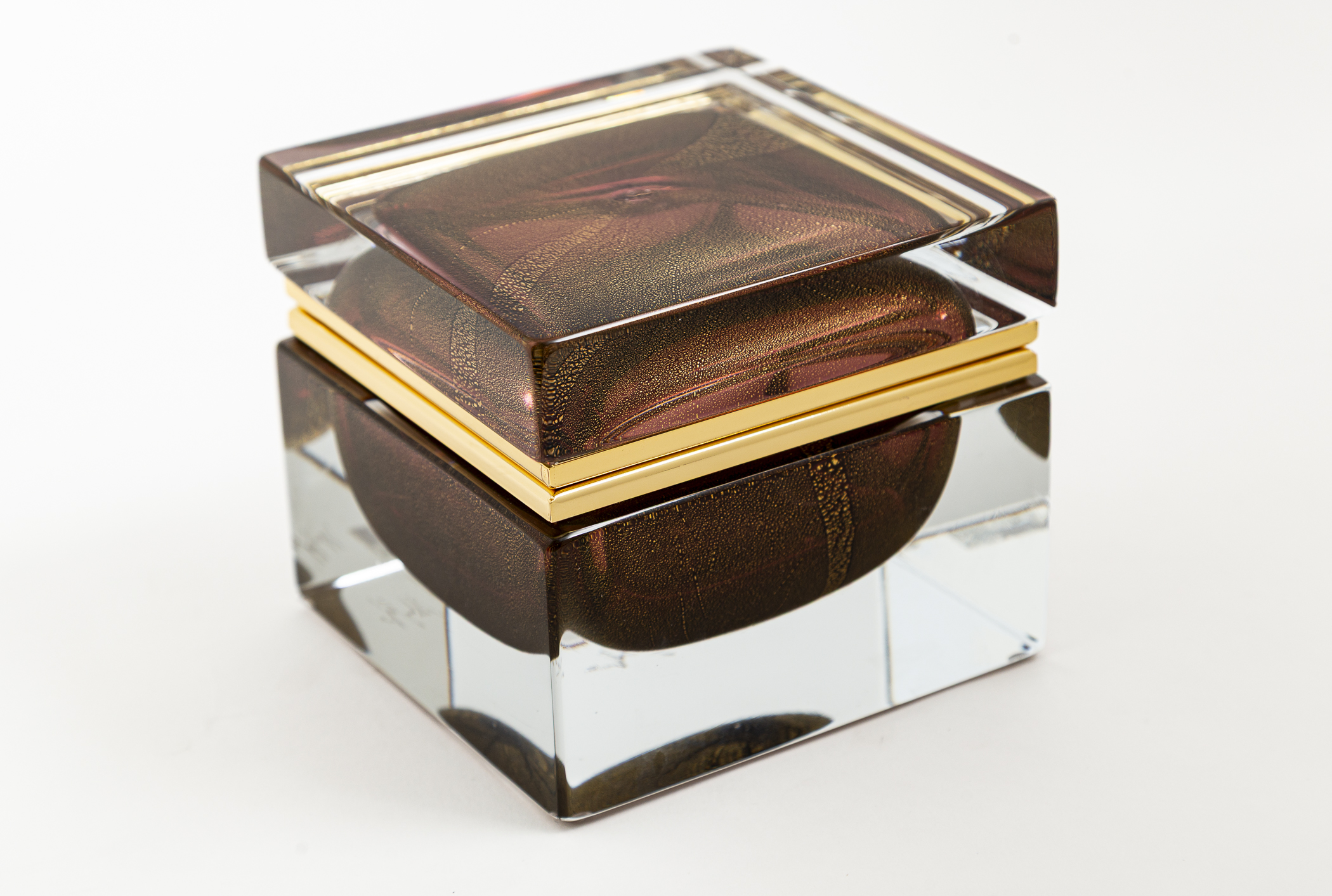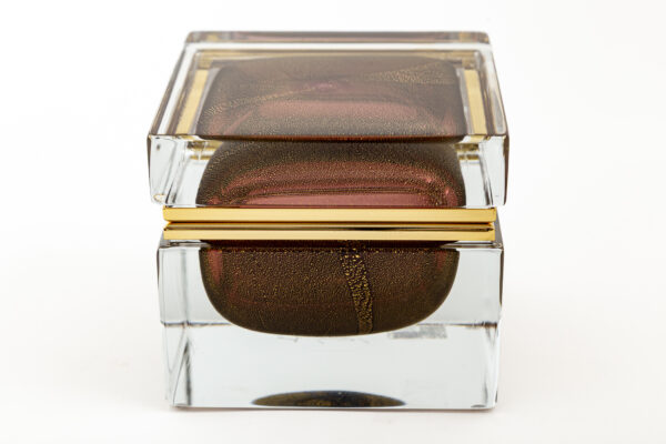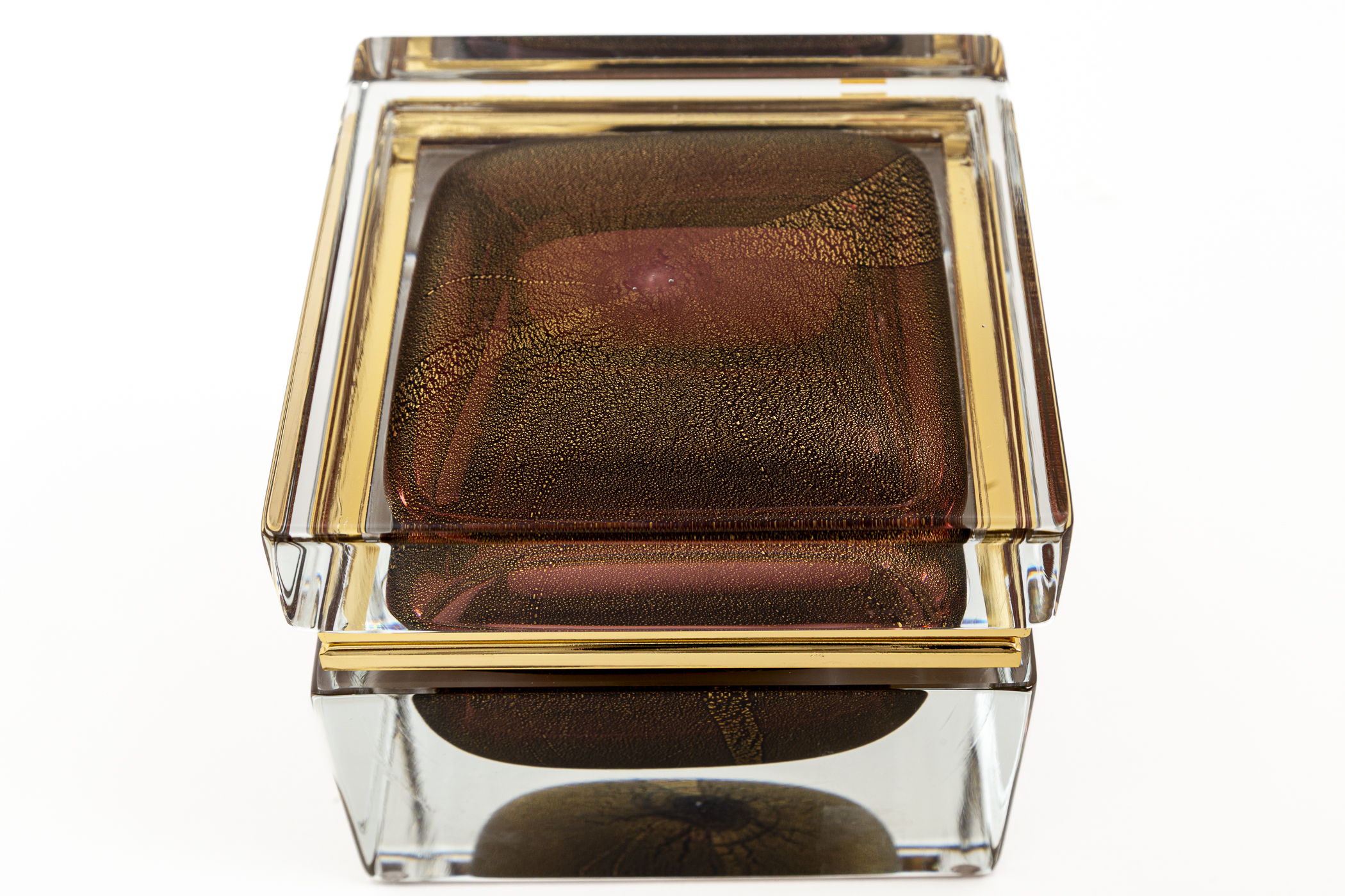 A splendid and timeless one of a kind Murano handcrafted large square-shaped clear blown glass box with sommerso floating gold infused deep amethyst pink orb center, customized sizing for each box with 14 k gold on brass fittings.