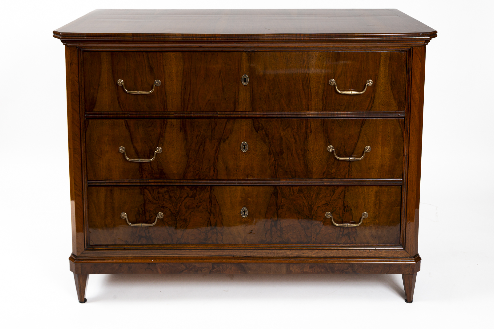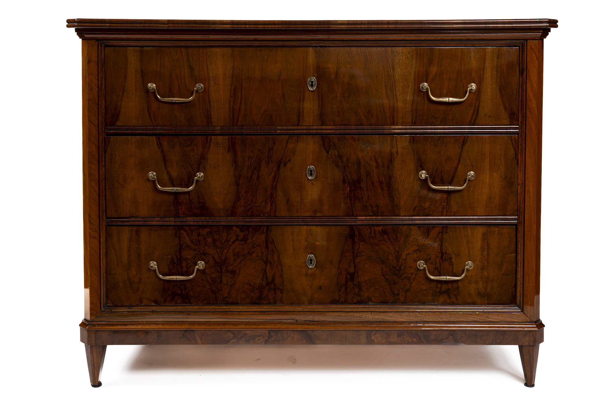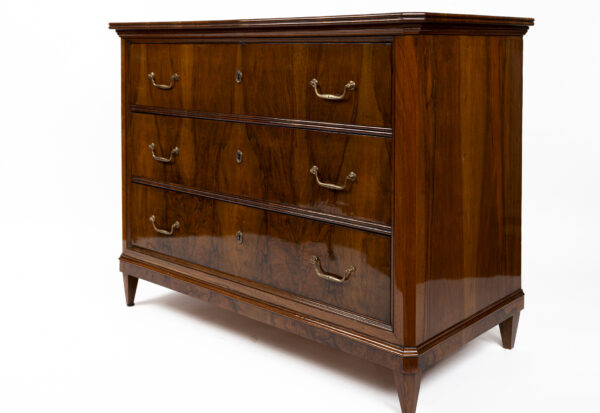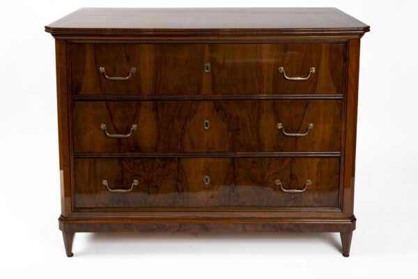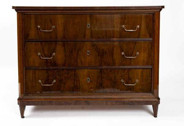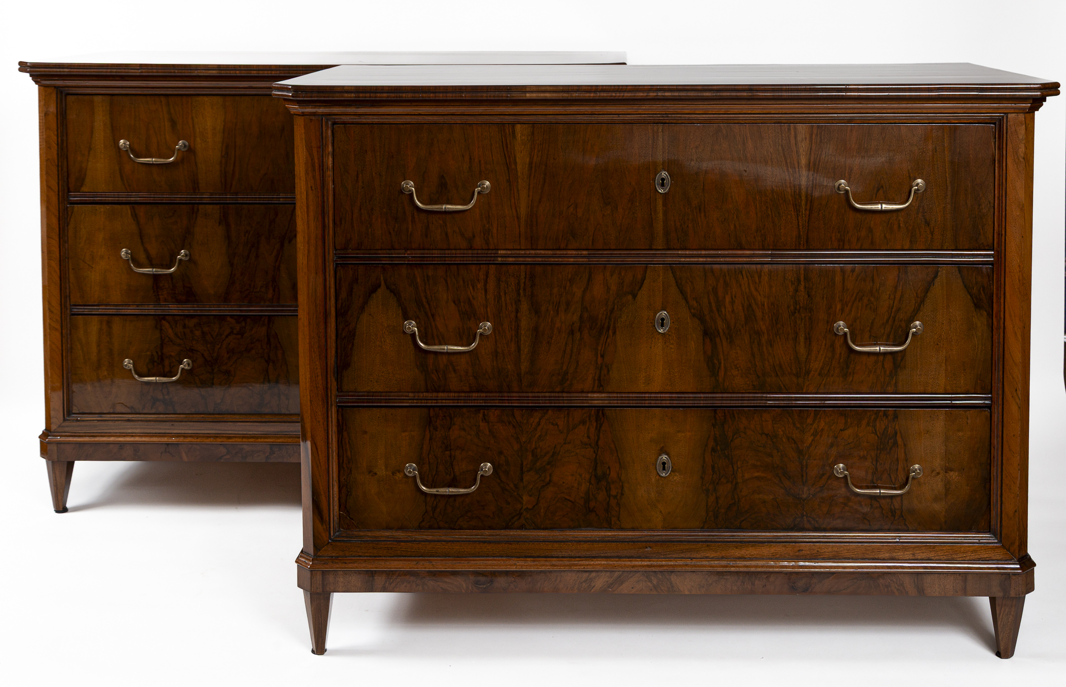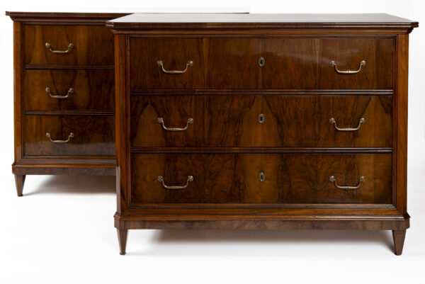 A fine pair of 19th Century of three drawer chests finishing on straight and tapered legs in a beautiful dark book-matched walnut veneer on pine with simple brass pulls and escutcheons. Note its plateau with book matched walnut veneer runs vertically continuing down its façade creating a waterfall effect. Keys provided for each lock.