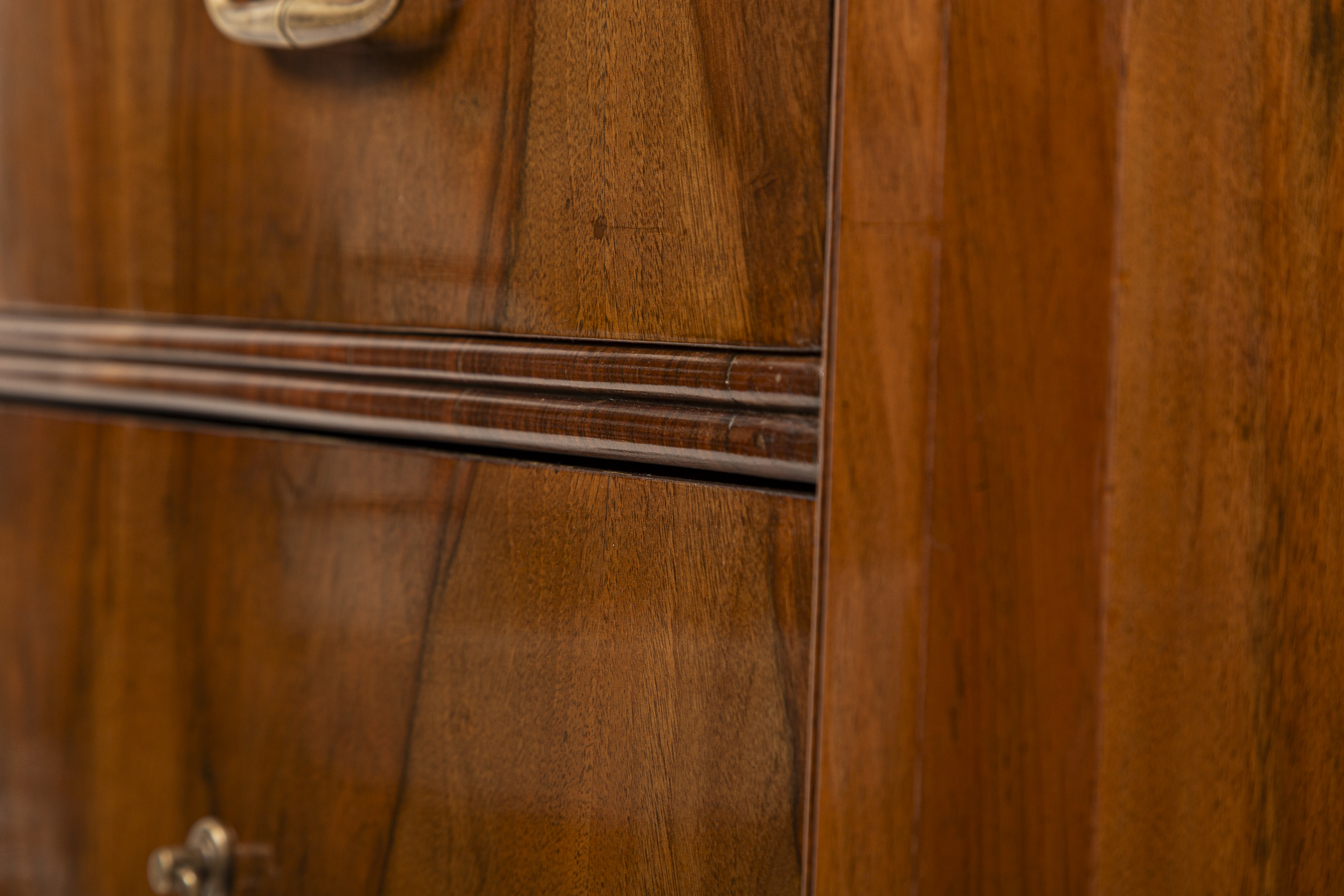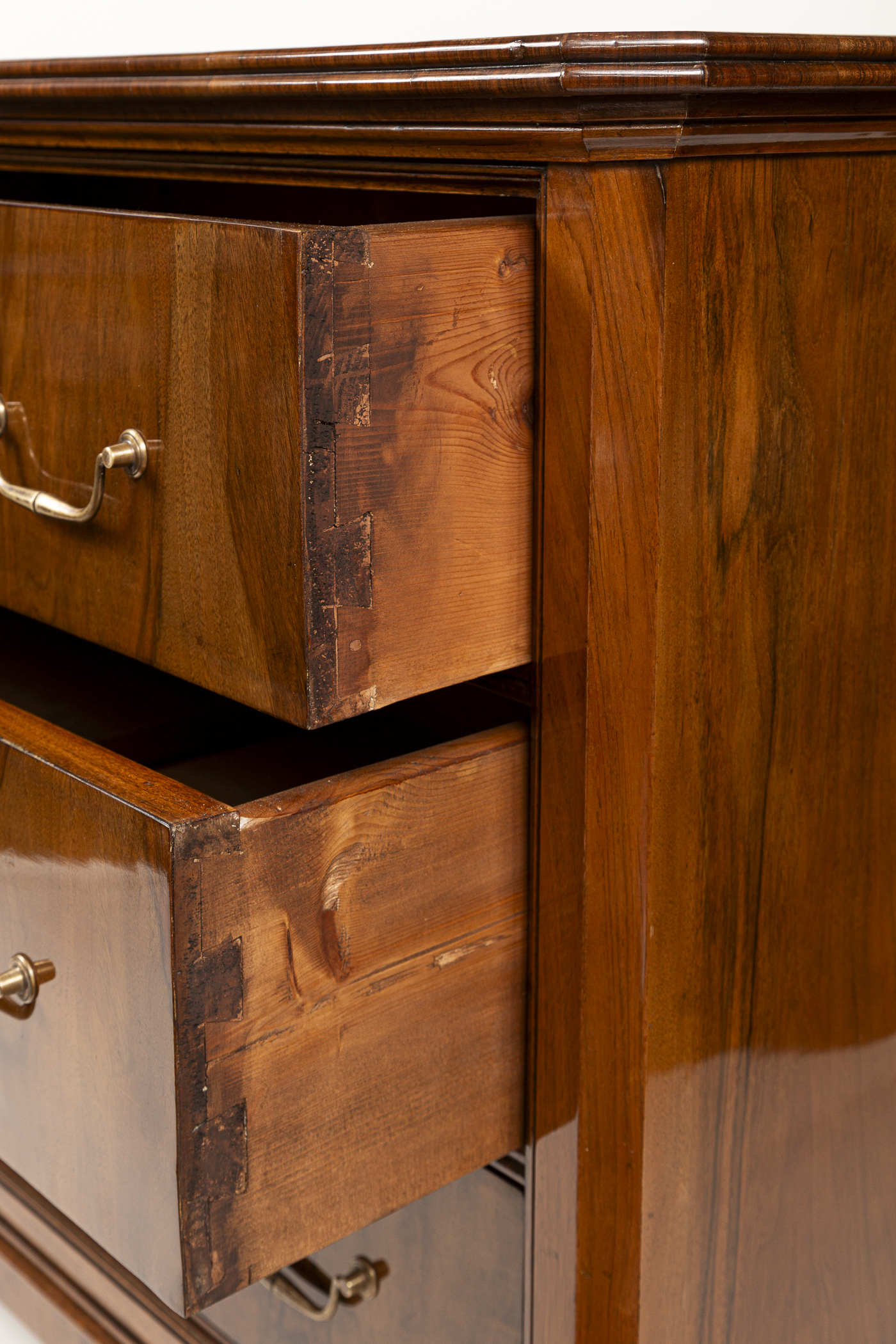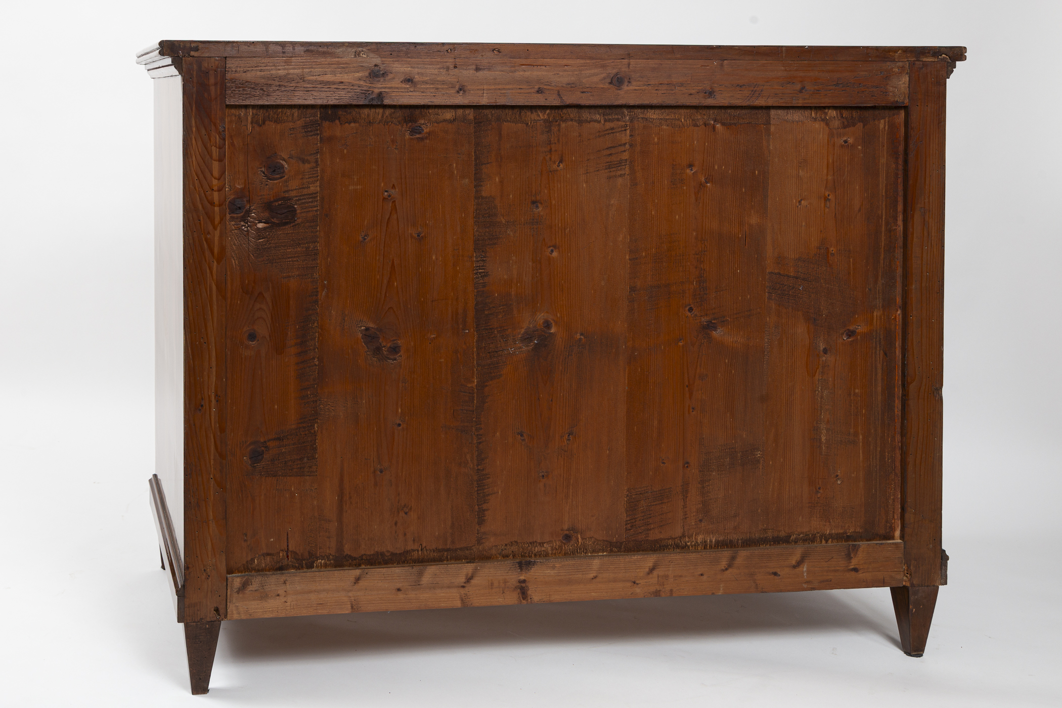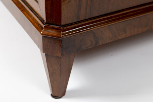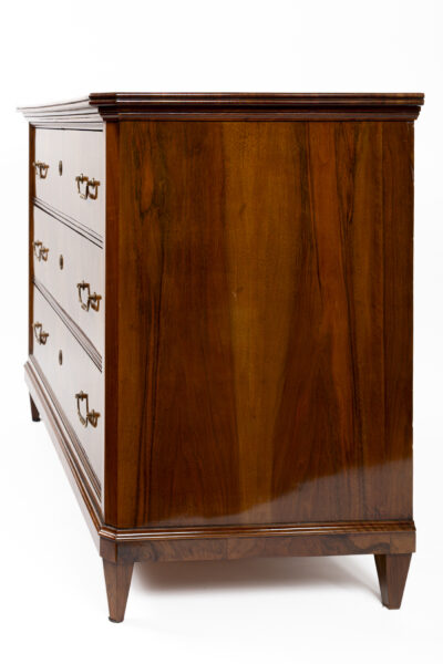 A fine pair of 19th Century of three drawer chests finishing on straight and tapered legs in a beautiful dark book-matched walnut veneer on pine with simple brass pulls and escutcheons. Note its plateau with book matched walnut veneer runs vertically continuing down its façade creating a waterfall effect. Keys provided for each lock.