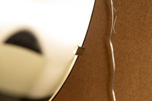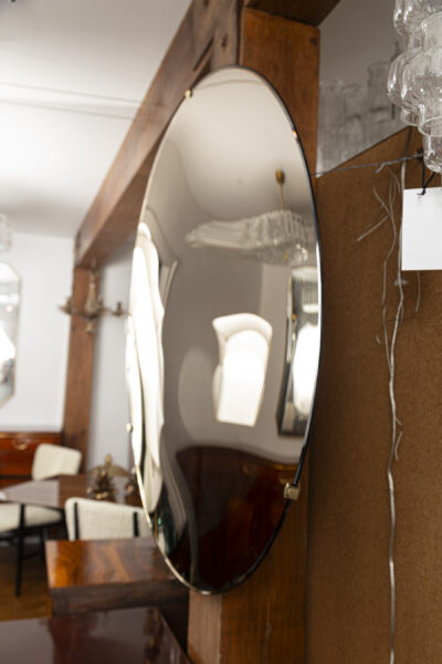 A dynamite sculptural and reflective piece of art made entirely by hand by Effetto Vetro, contemporary Italian artisans that are inspired by the colored glass makers such as Fontana of the 1950’s. Here they have produced a sleeker more modern version by first shaping the concaving form and then after this is thermoformed it is then silvered by hand, this one to a lovely and timeless light bronze color and then baked again in the ovens. Then hand polishing ensues. Once complete the reflective mirror is suspended on a high polished brass frame upheld by three clips creating a lovely contrast of color from the mirrored surface.