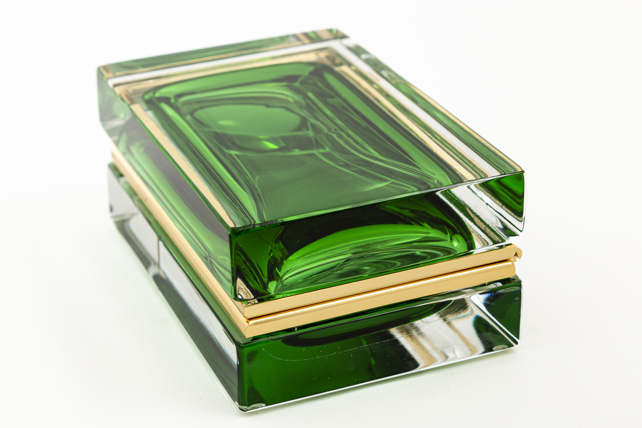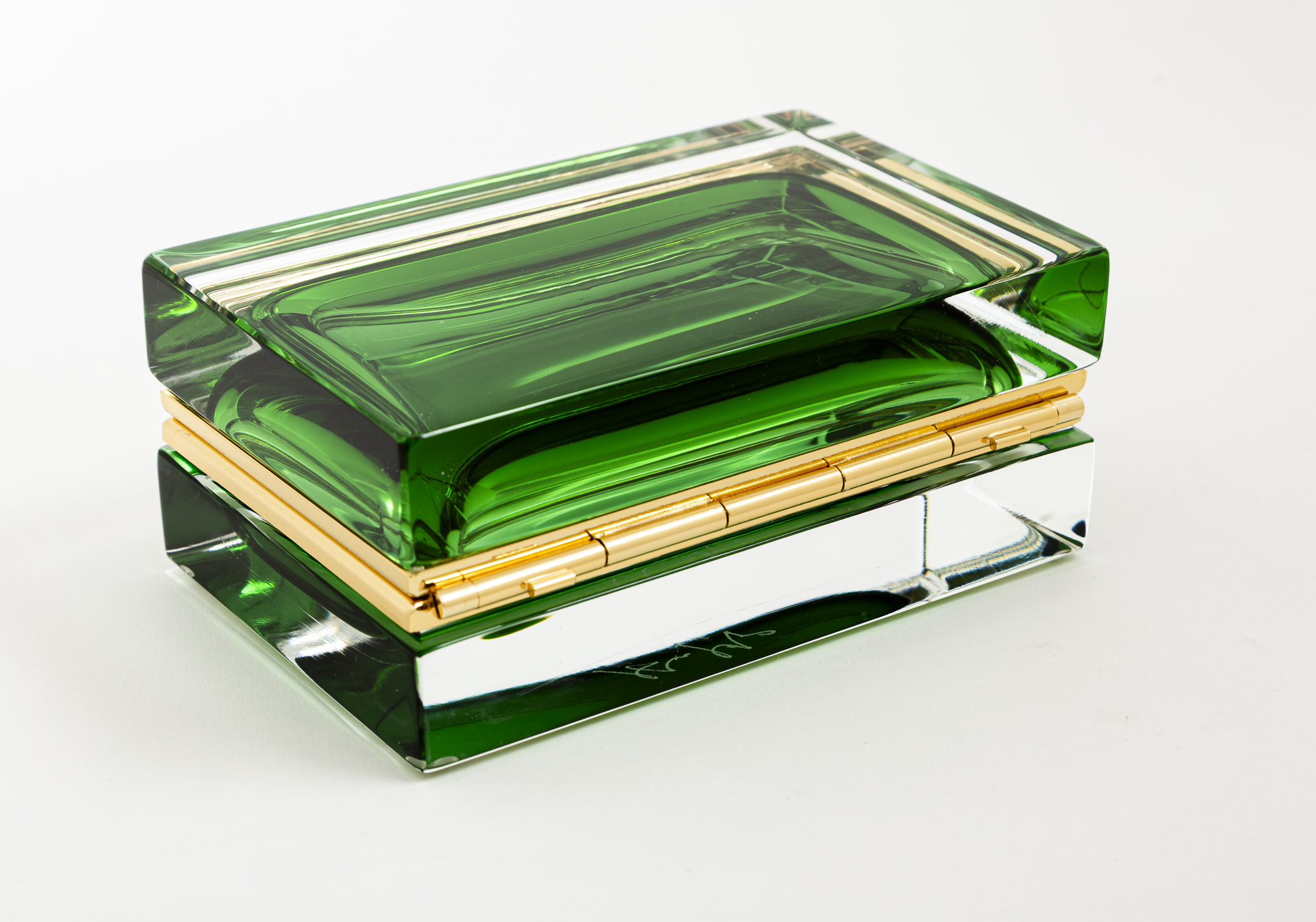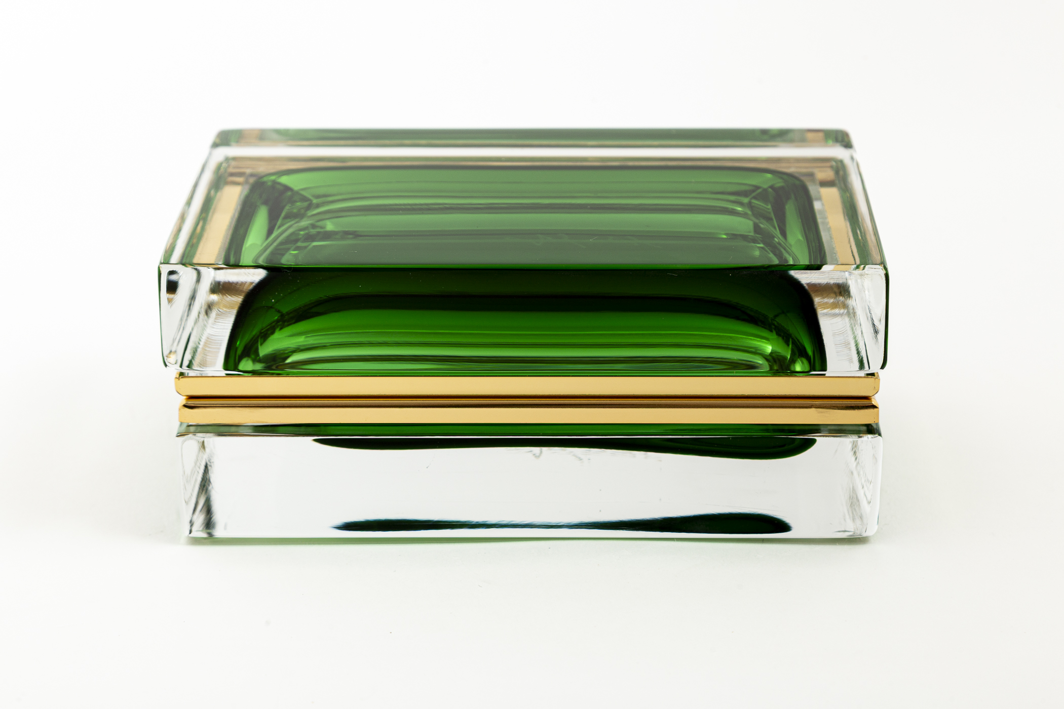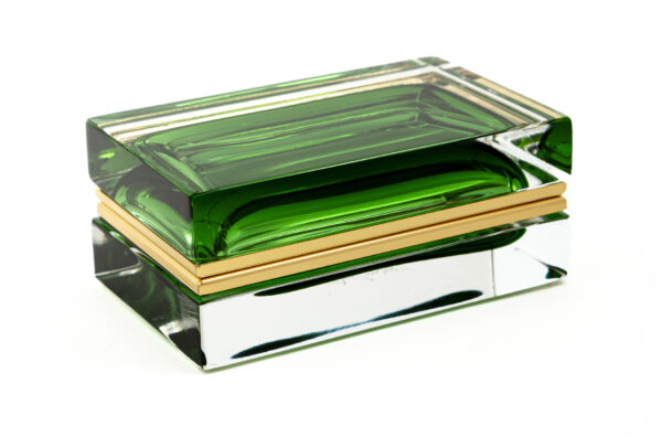 One of a kind Murano handcrafted low rectangular shaped clear blown glass box with floating  green orb center creating a beautiful sculptural effect, each  box with its own customized 14 k gold on brass fittings.