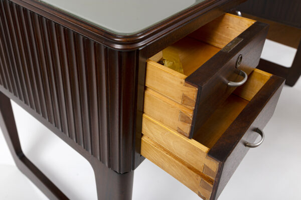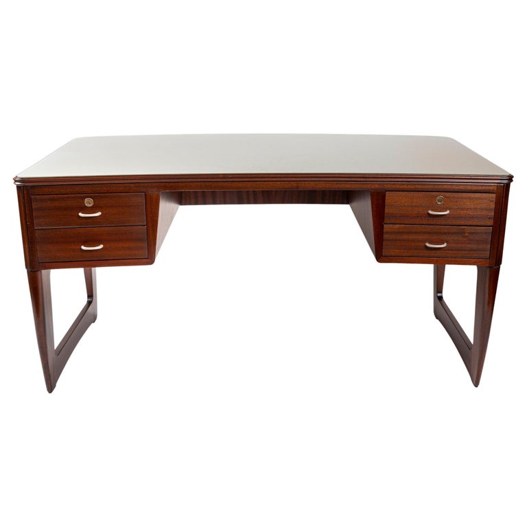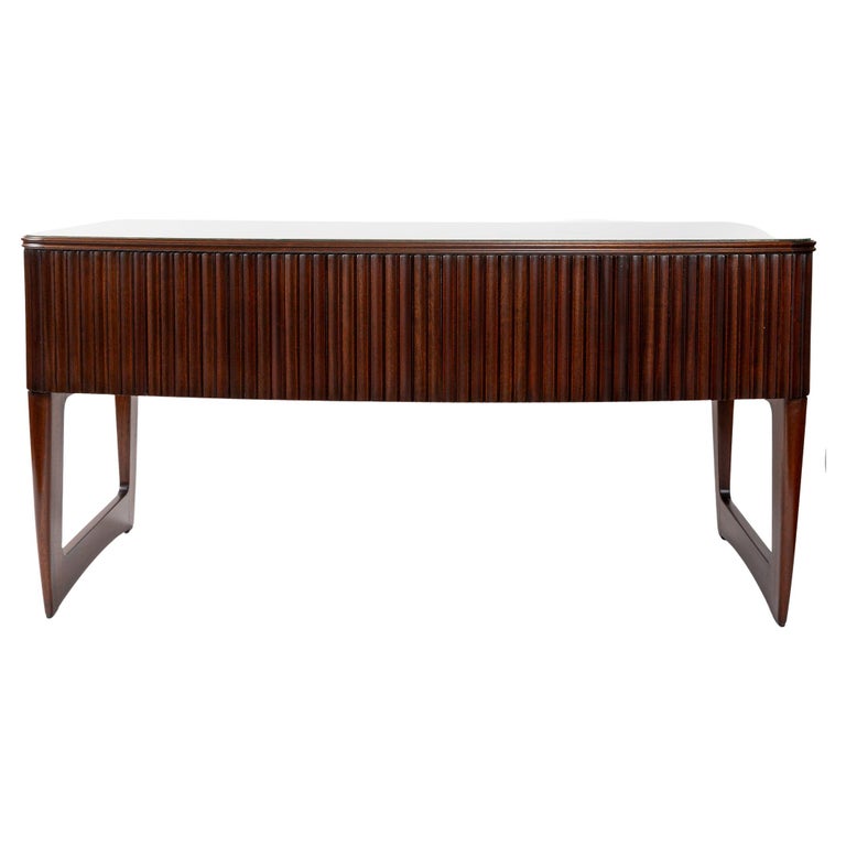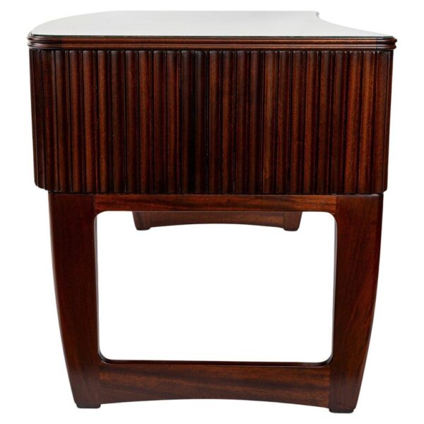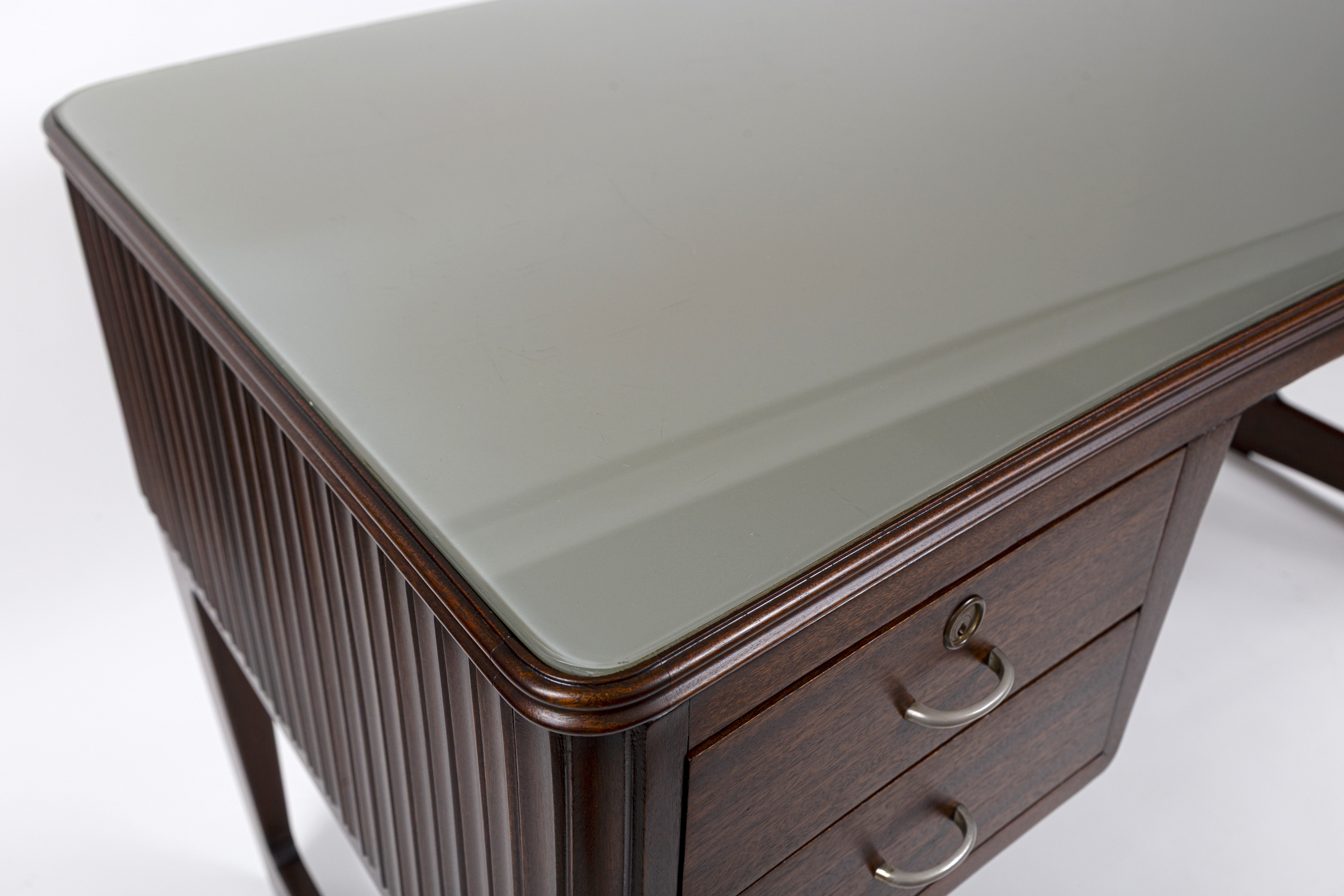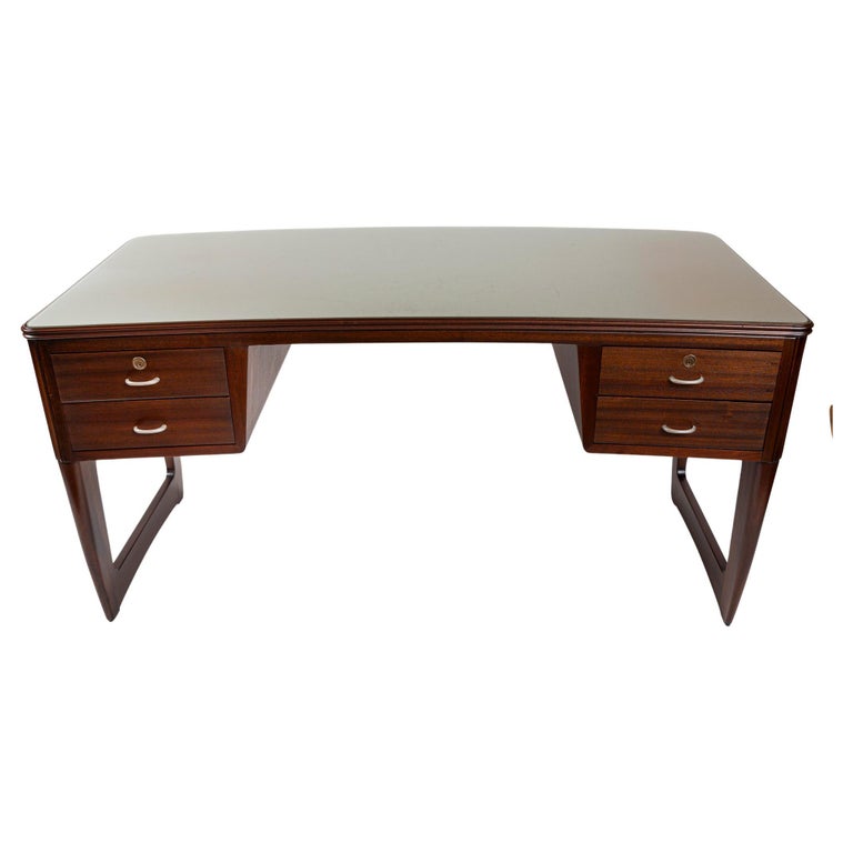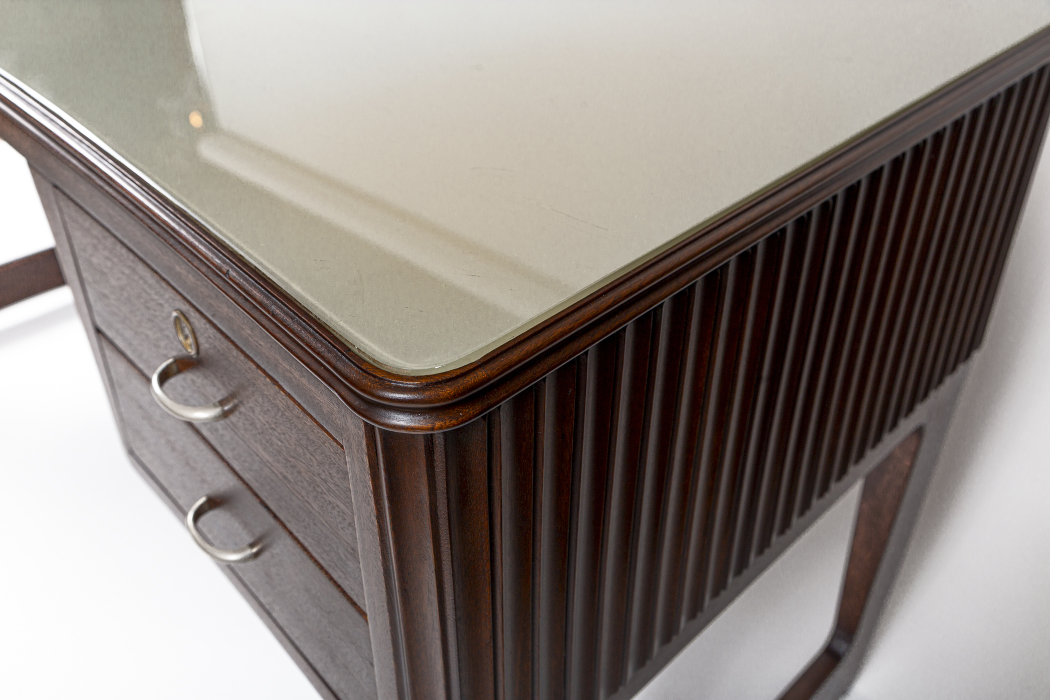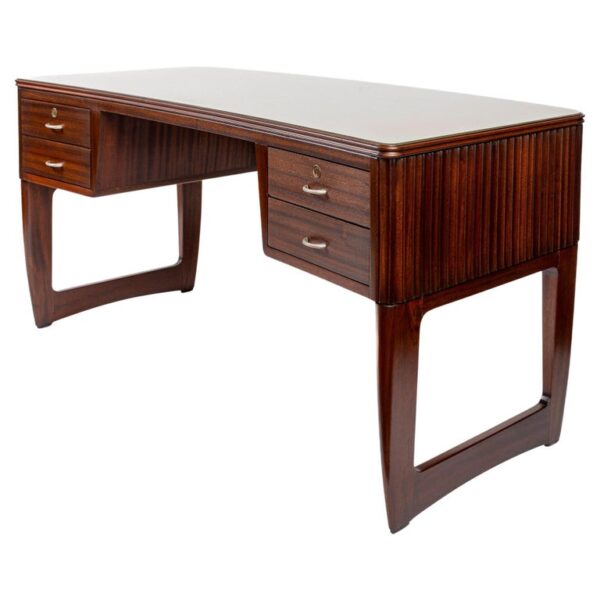 Large Mid Century Italian Executive Desk fully finished on all sides and comprised of harmonious arching forms. Its curved shaped double molded plateau is inset with a soft pearled grey-green back painted glass above four incurving drawers shown with its original curved matte nickeled finish brass handles. . Characteristic of Buffa’s finest works, the remaining three sides are hand carved with incurved ribbed detailing.