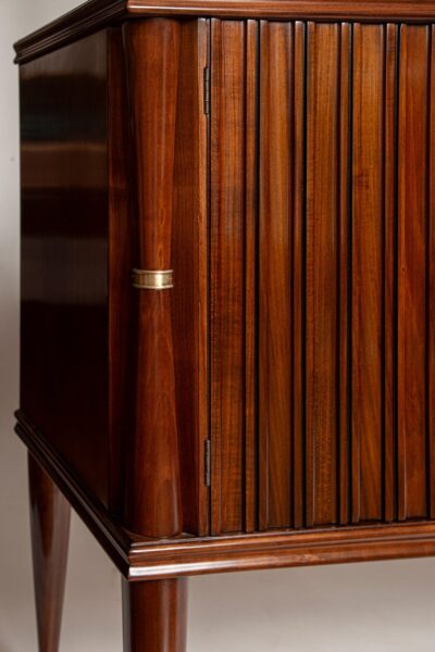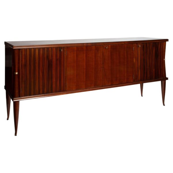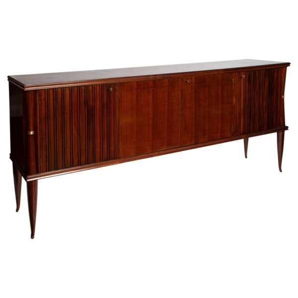 A lovely and delicately proportioned four door sideboard flanked with bowtie columns adorned with brass fittings and finishing on very high rounded and slightly splayed legs.