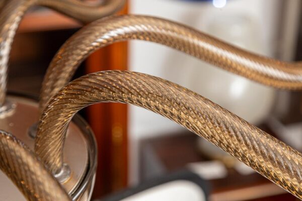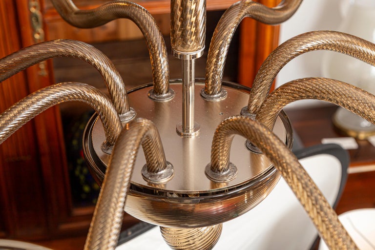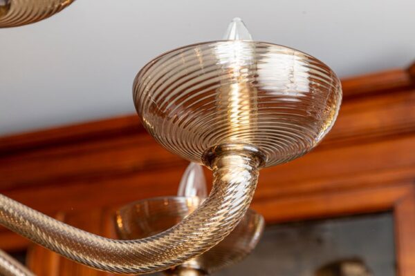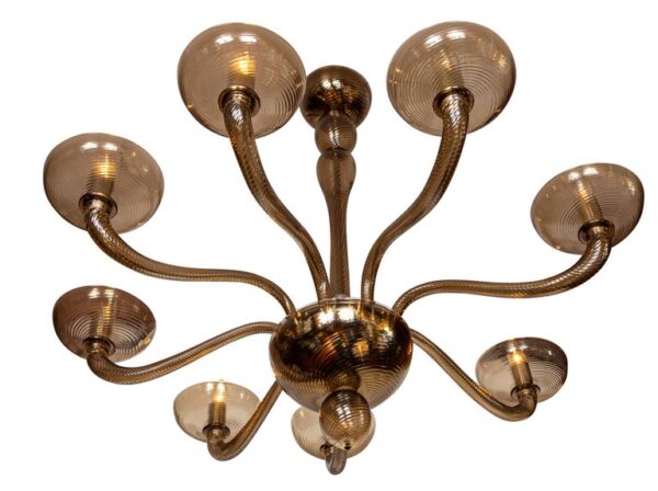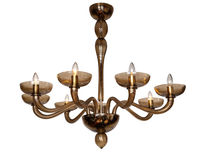 A wonderful unique custom designed Murano uplight chandelier consisting of soft arching shapes with each piece mouth blown in a uniform twisting torchere creating a lovely swirl effect and capturing a much greater reflection of light and play of this warm tobacco color.