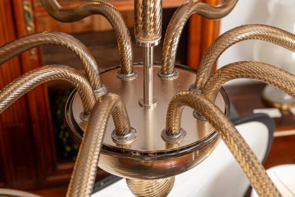 This fixture is engineered so the canopy will install directly into the ceiling for a clean and sleek look. The center shaft with fluted column is met with eight outreaching arms holding illuminated arched bobeches and upheld by a large center bowl finishing with one large rounded toupie finial. The swirling torchere technique was inspired by Veninis’ 1940’s models but modified with cleaner lines and more sober colors.