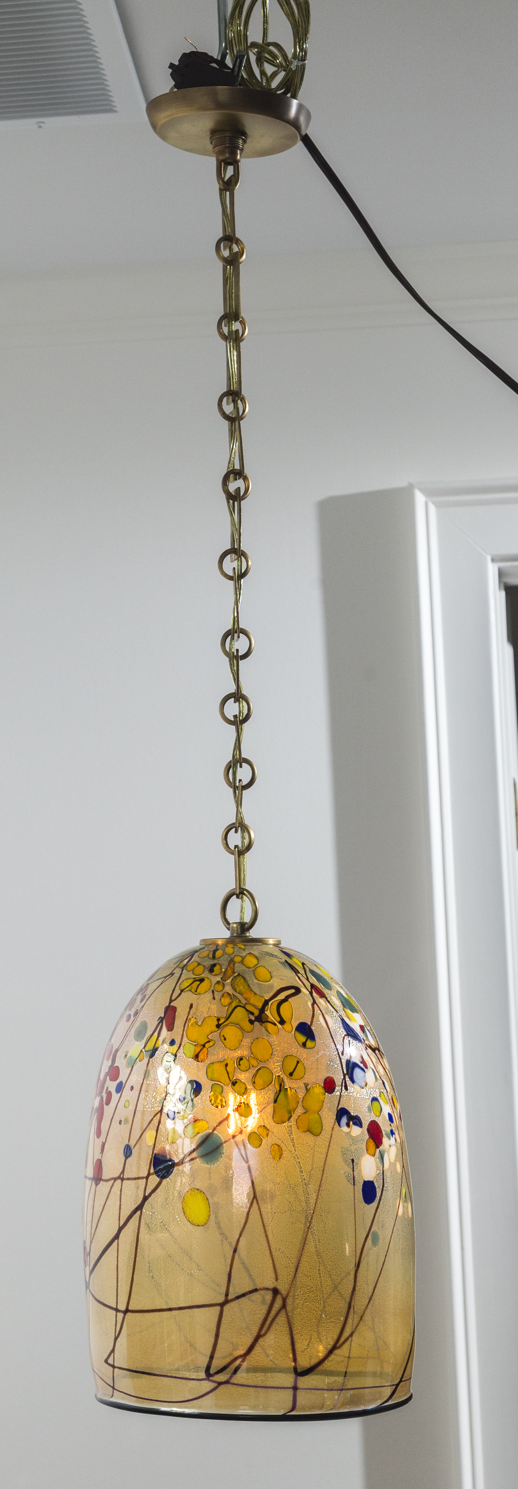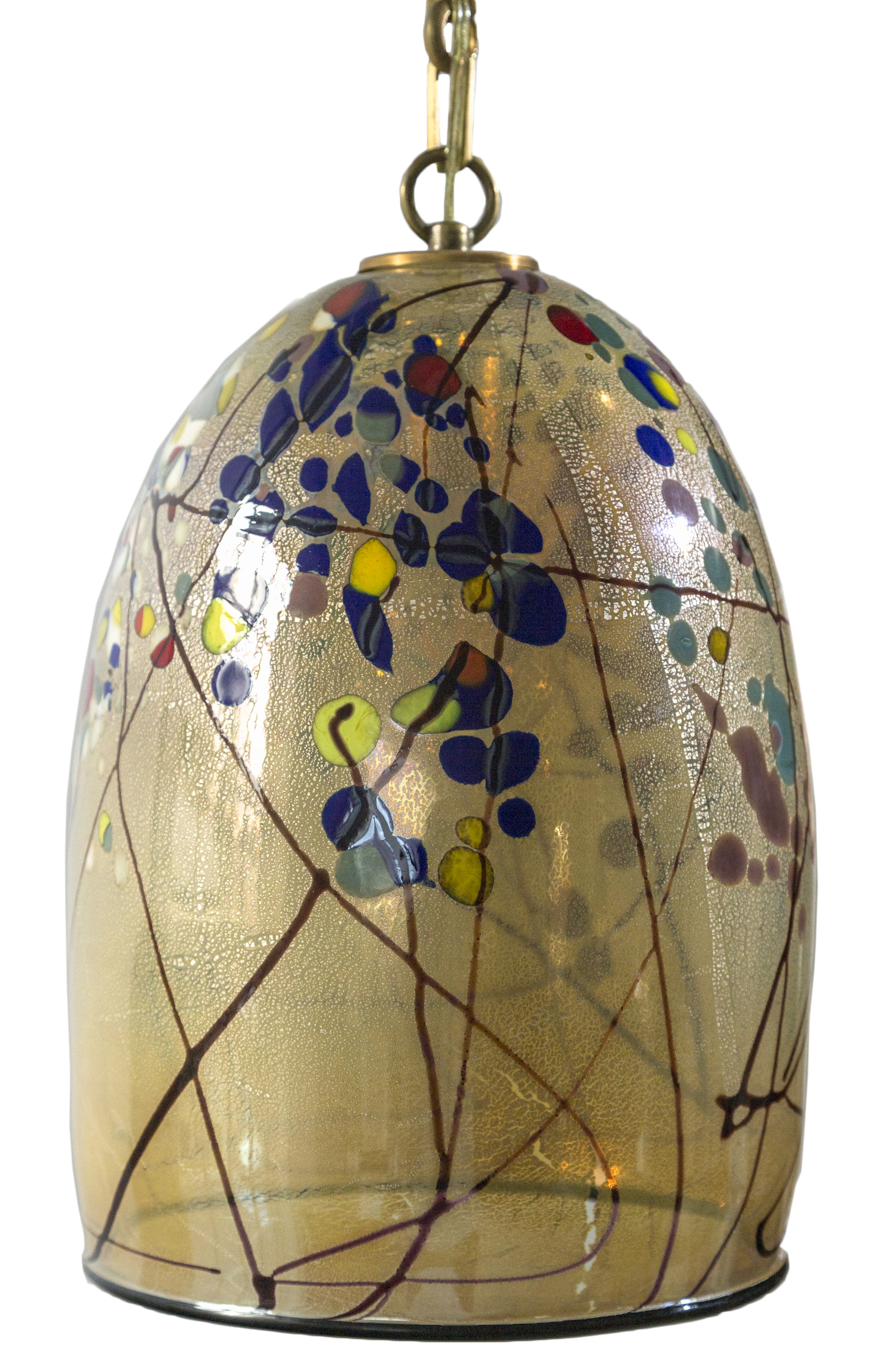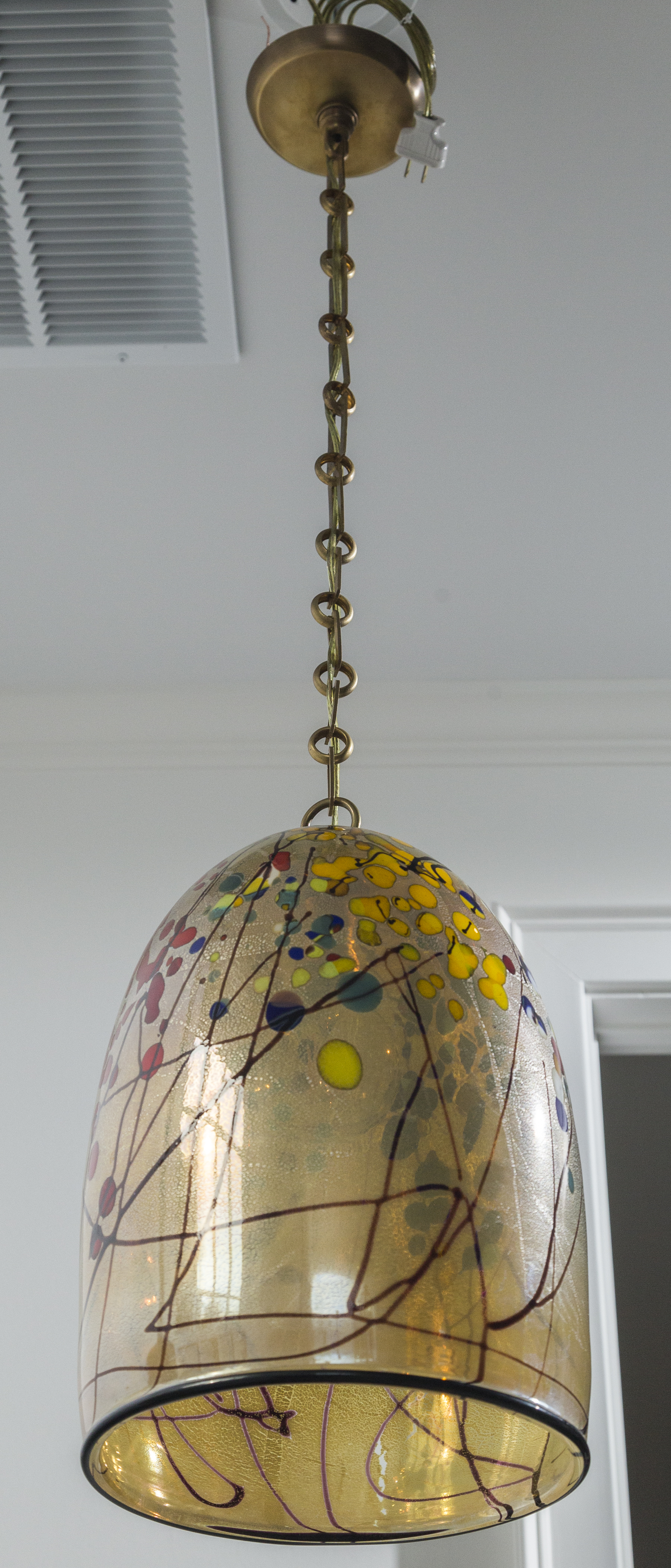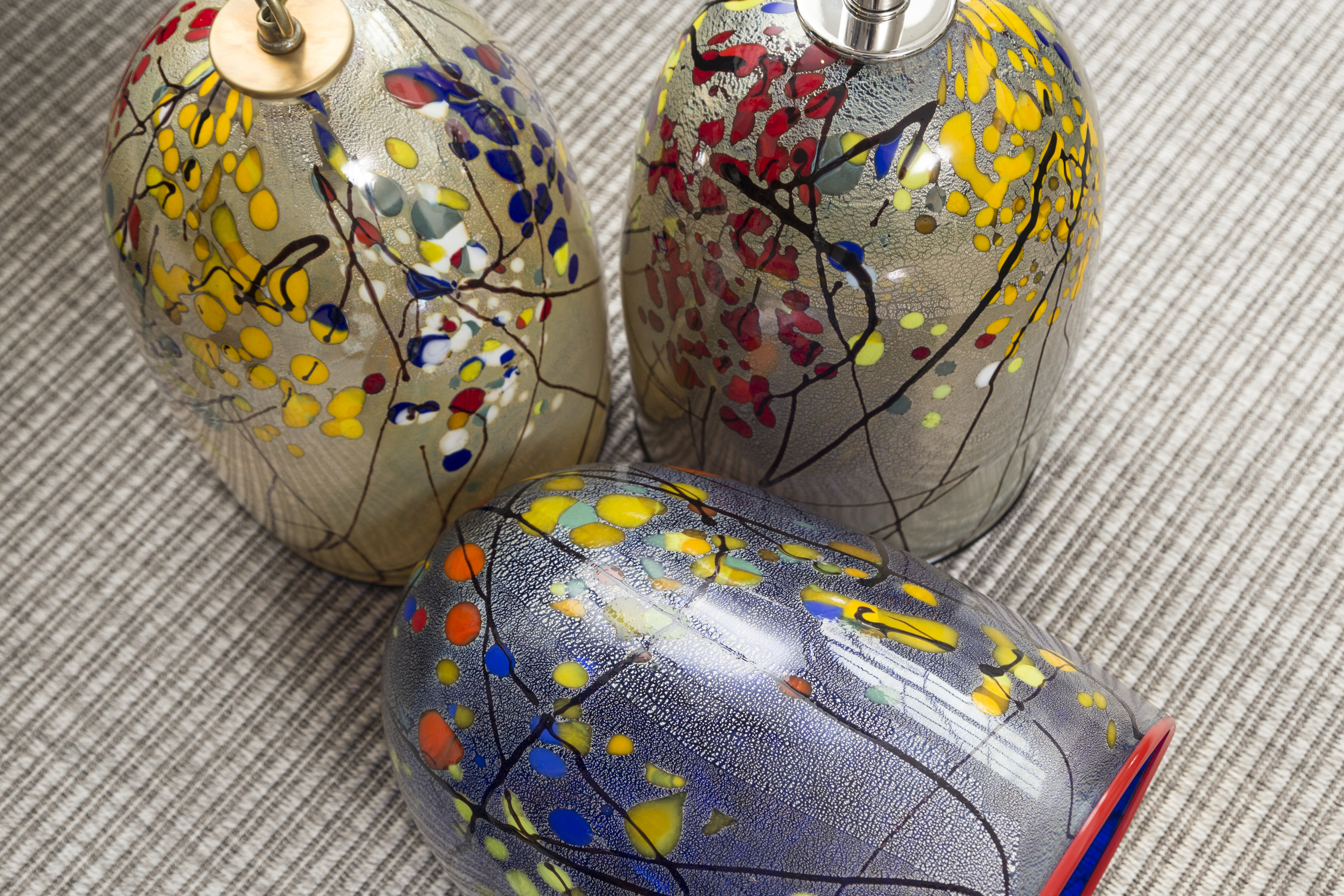 Vibrant modern glass blown pendants available is gold with silver (shown), grey with silver and blue with silver base colors with your lamping of choice.
