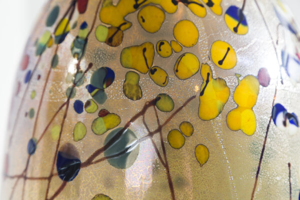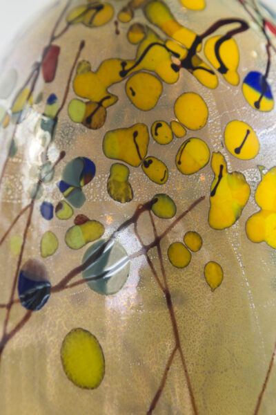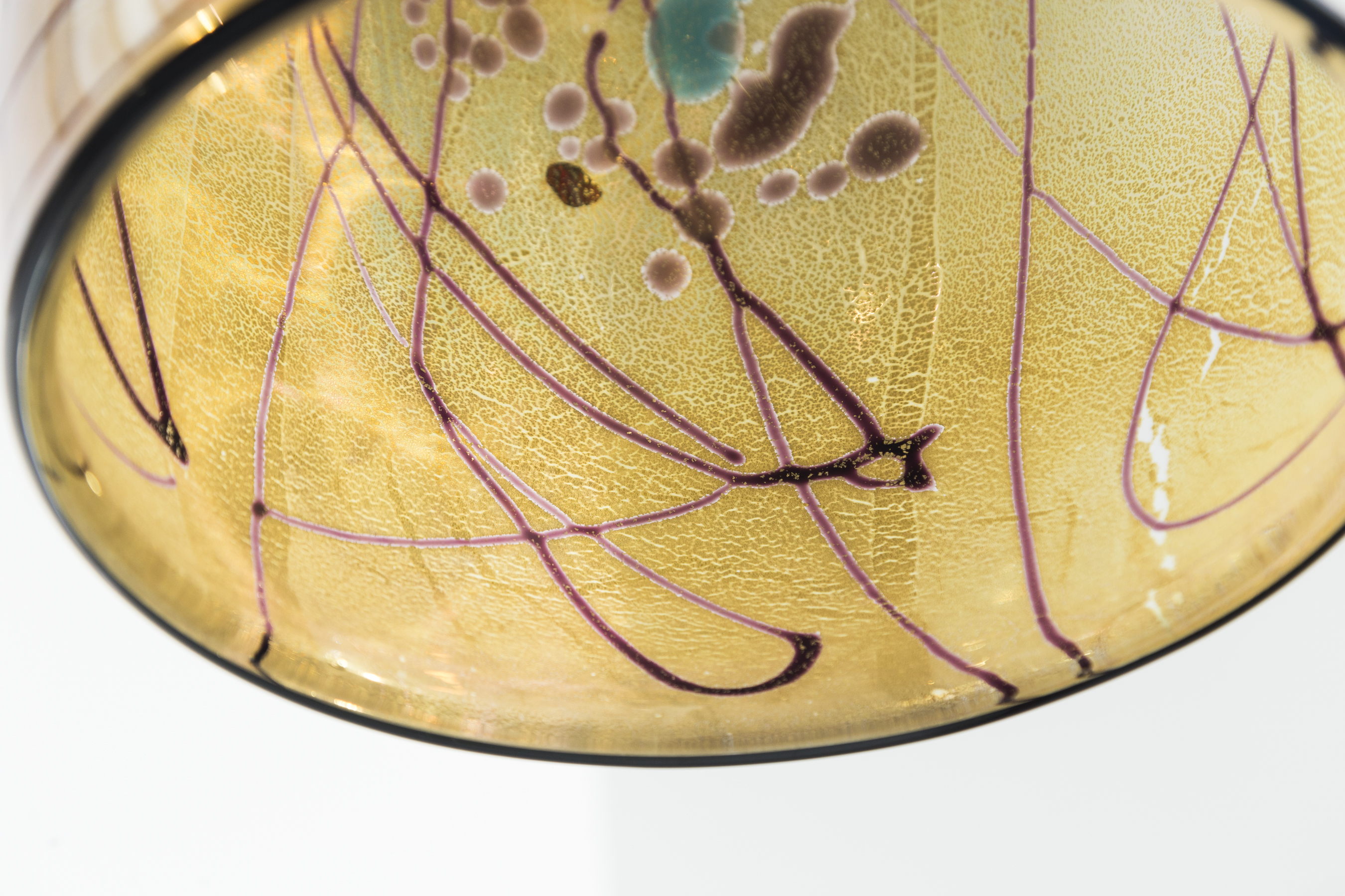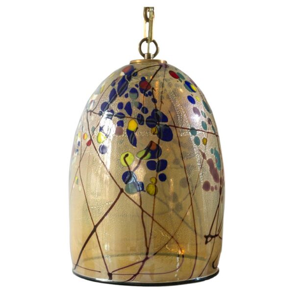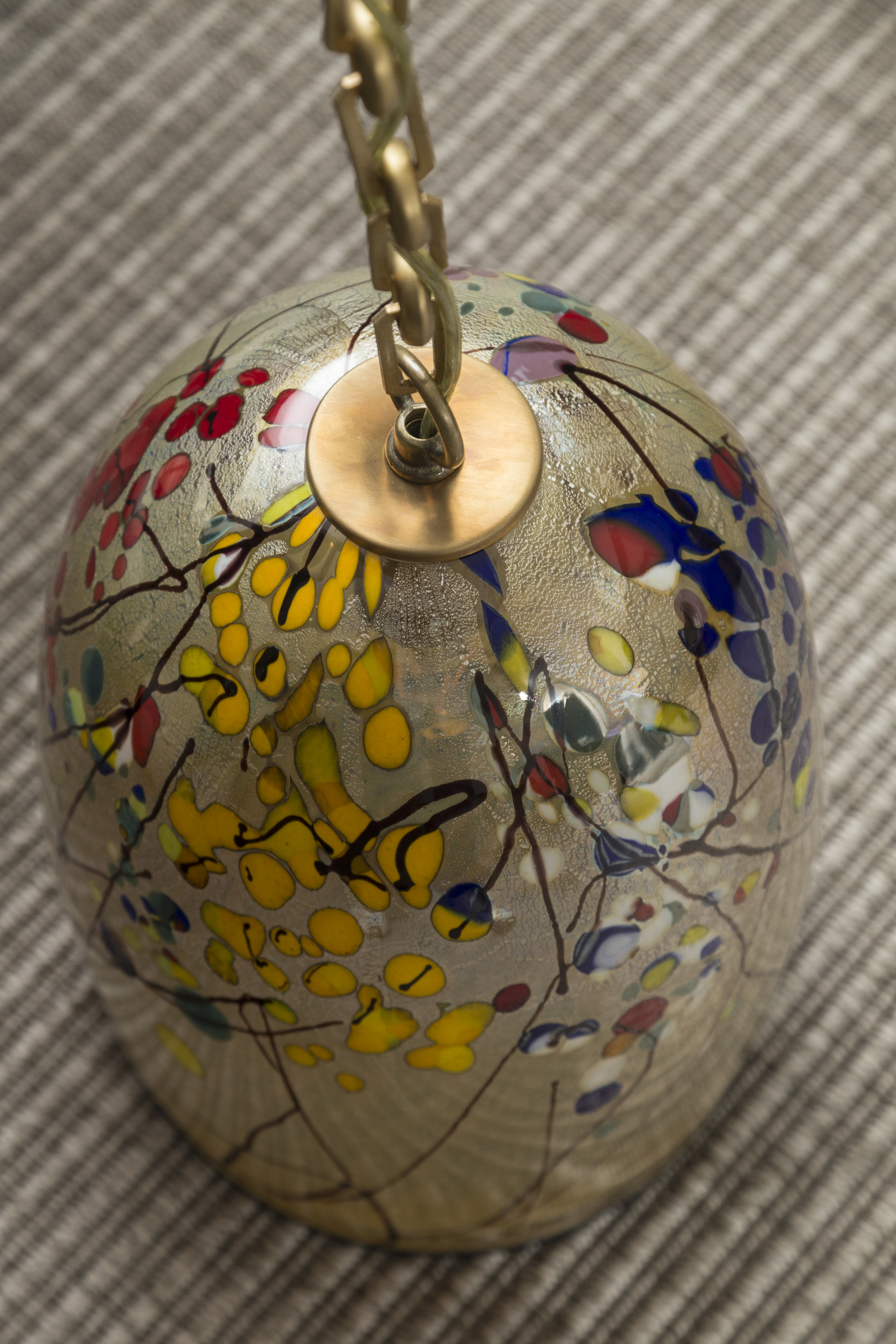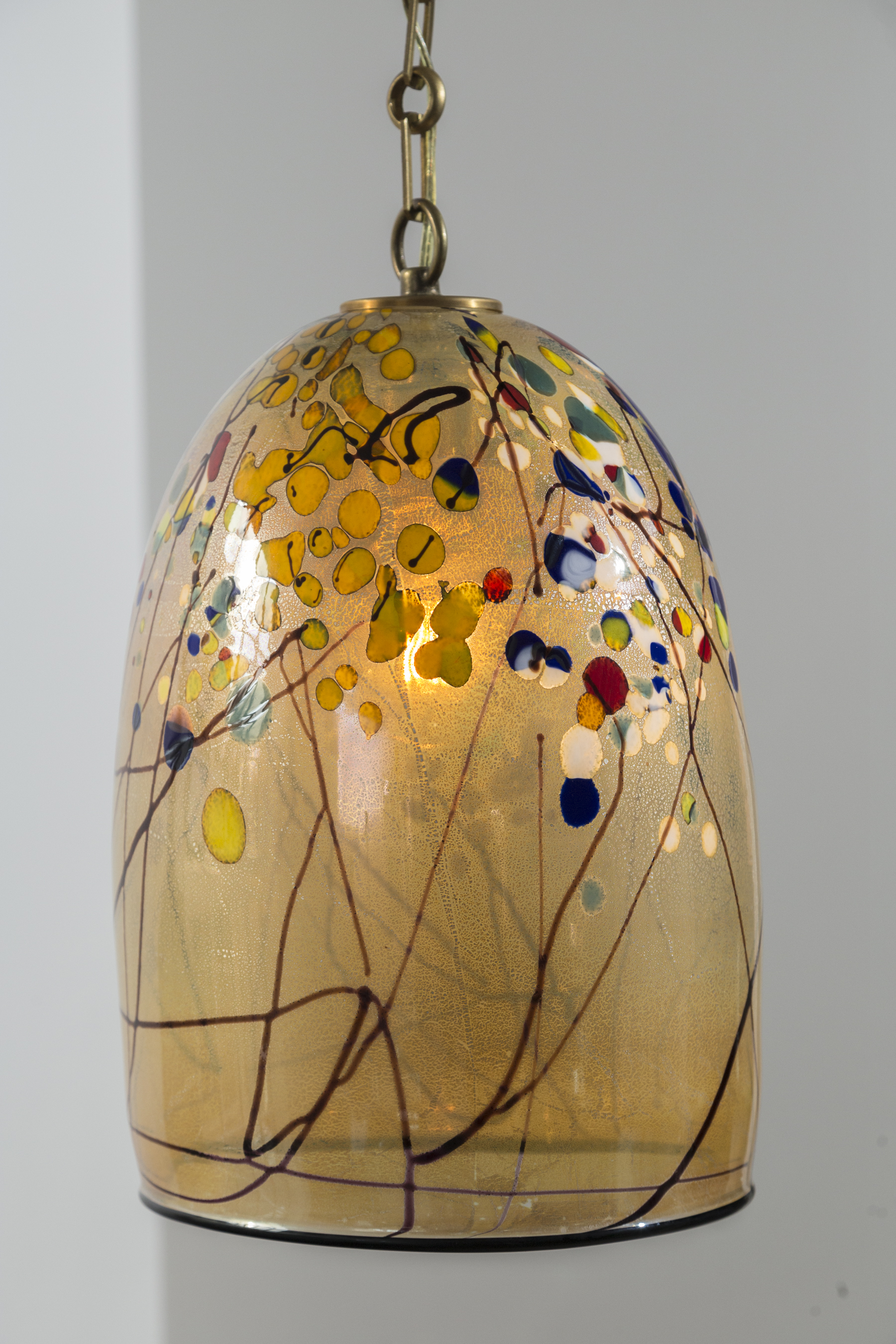 Vibrant modern glass blown pendants available is gold with silver (shown), grey with silver and blue with silver base colors with your lamping of choice.
