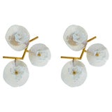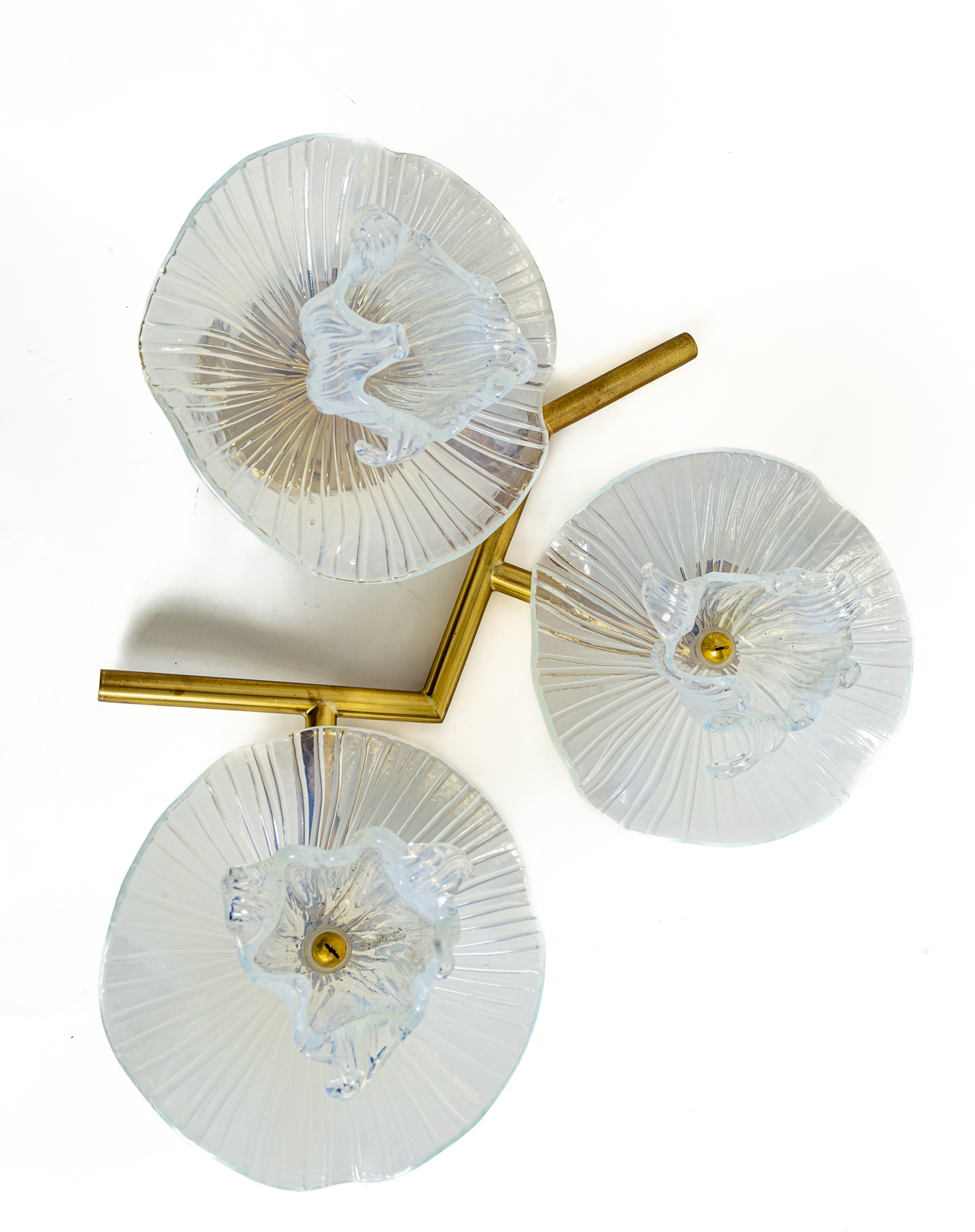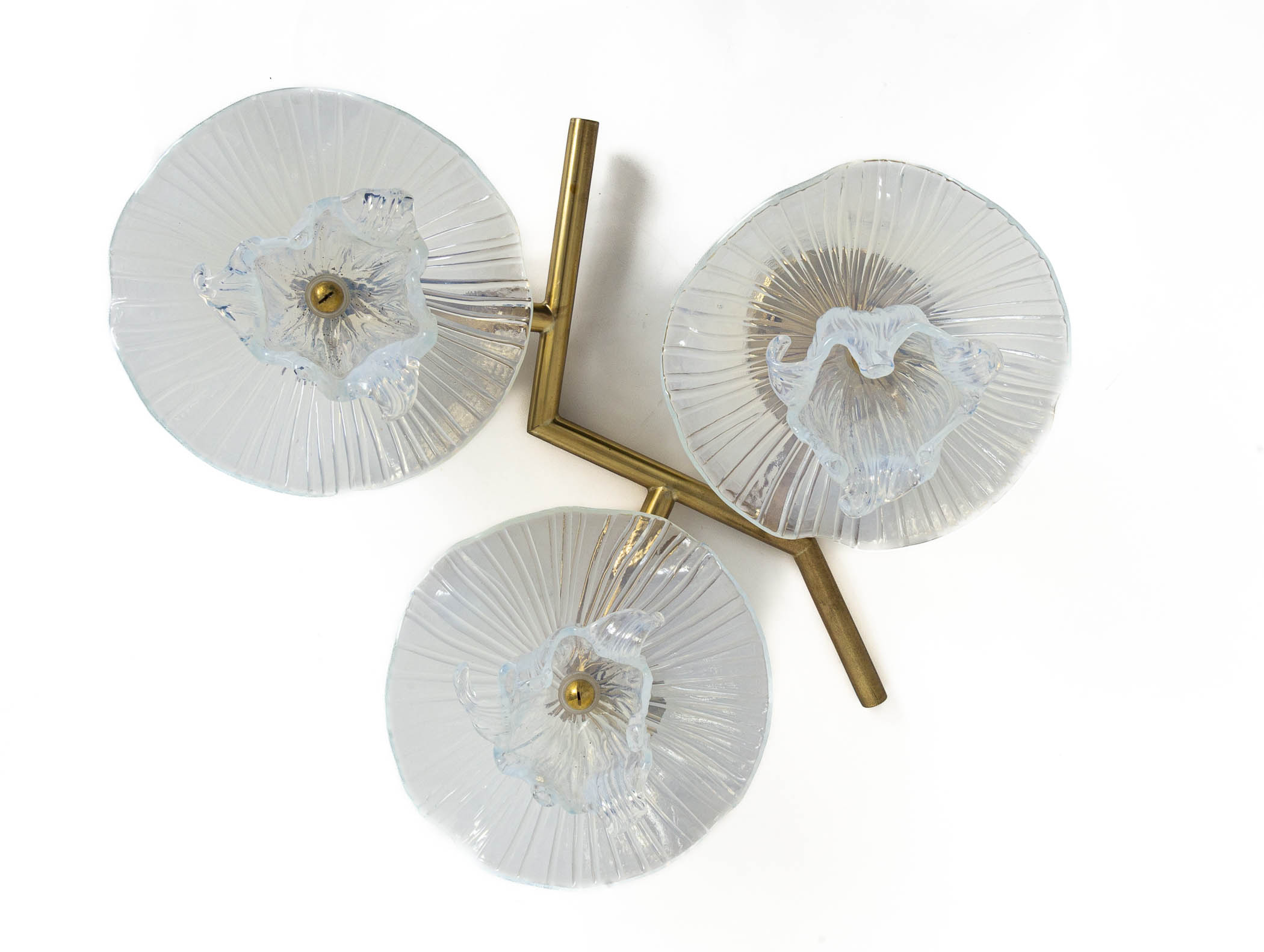 A sculptural set of three iridescent opaque blown flowers set upon a brass frame. Each brass frame is identical, the glass blown flowers vary slightly from one another. May be installed in any direction.