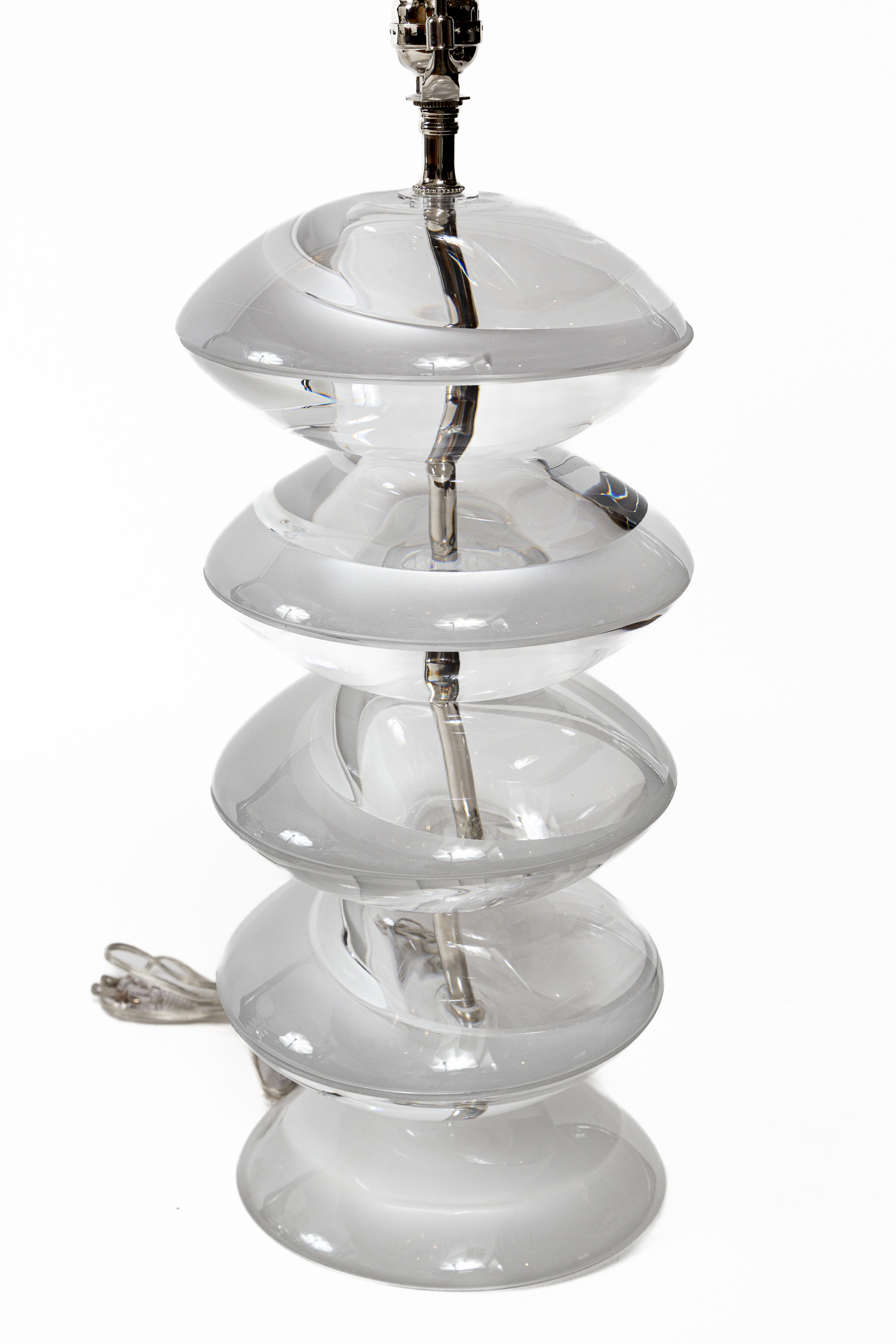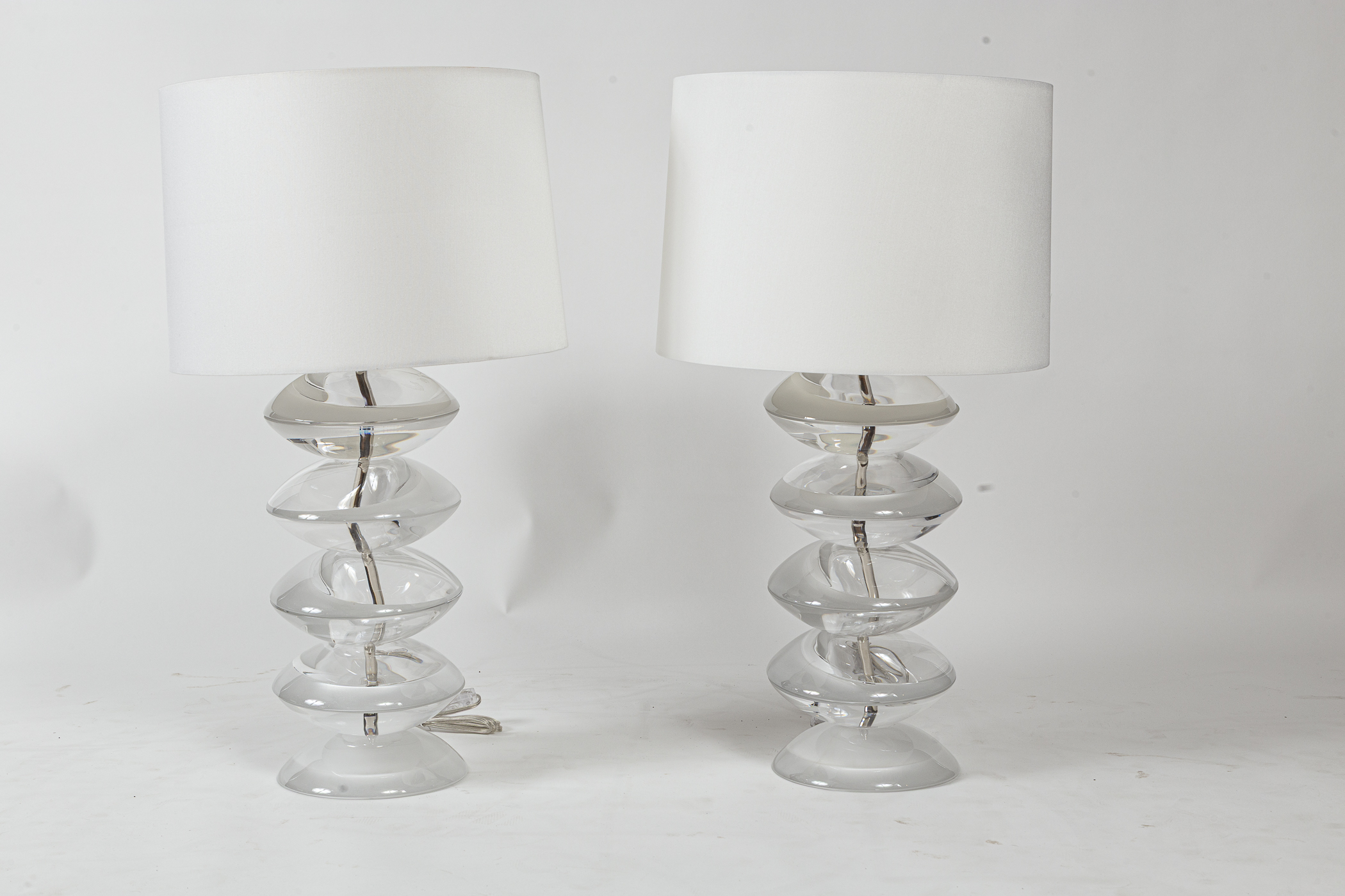 An extraordinary pair of unique Murano glass lamps each comprised of 9 heavy handlblown disks creating a unique lens effect.  Each disk is stacked, matched and aligned to continue the white swirl present on each disk and joined to form 4 stacked spheres on a nickel center frame.