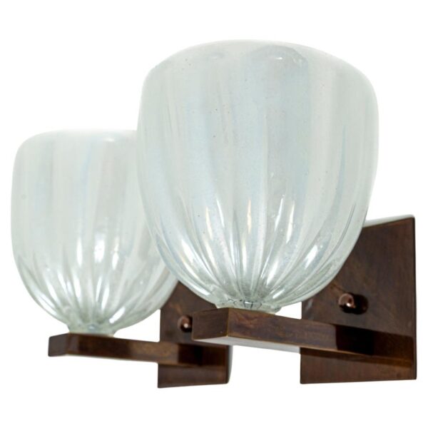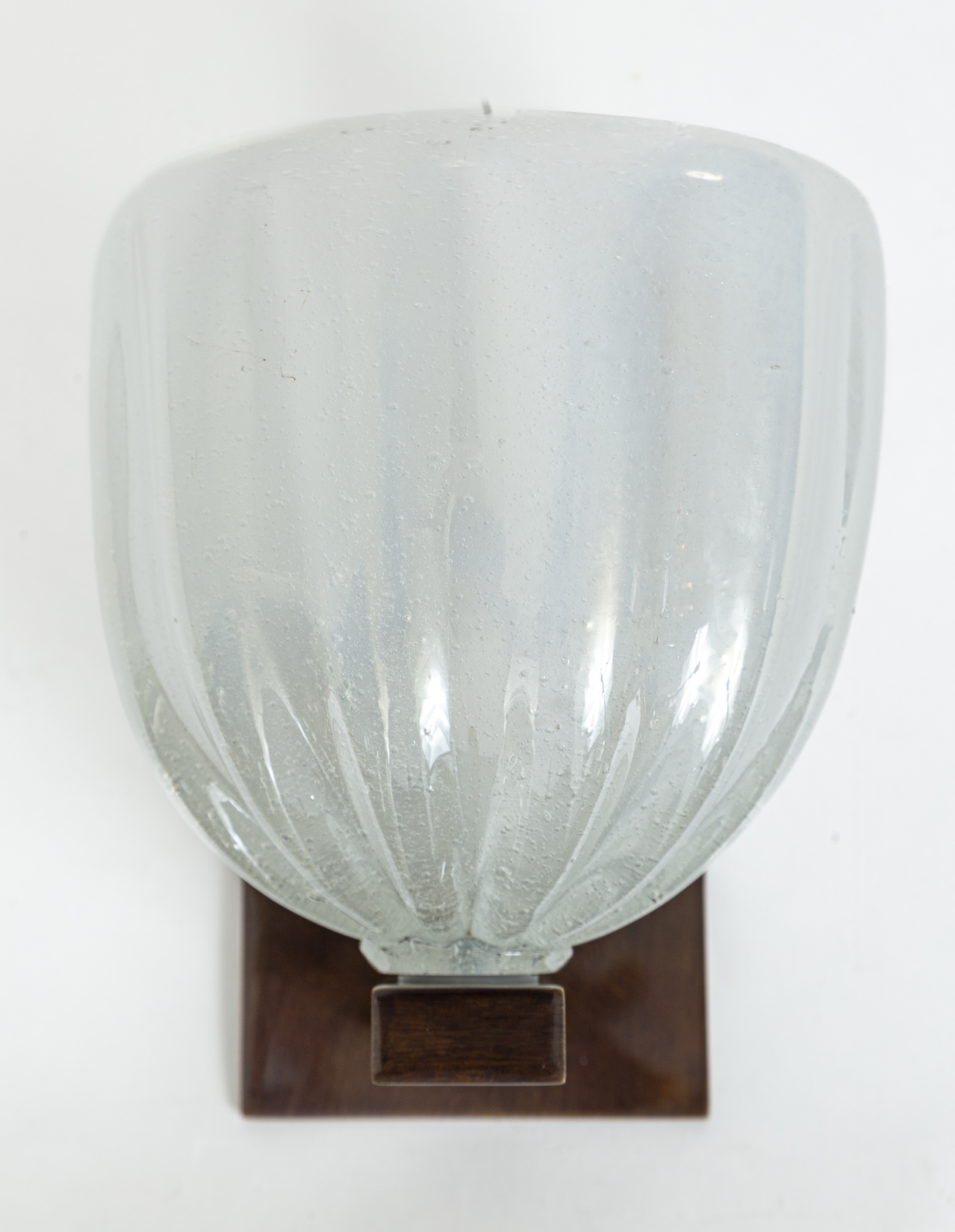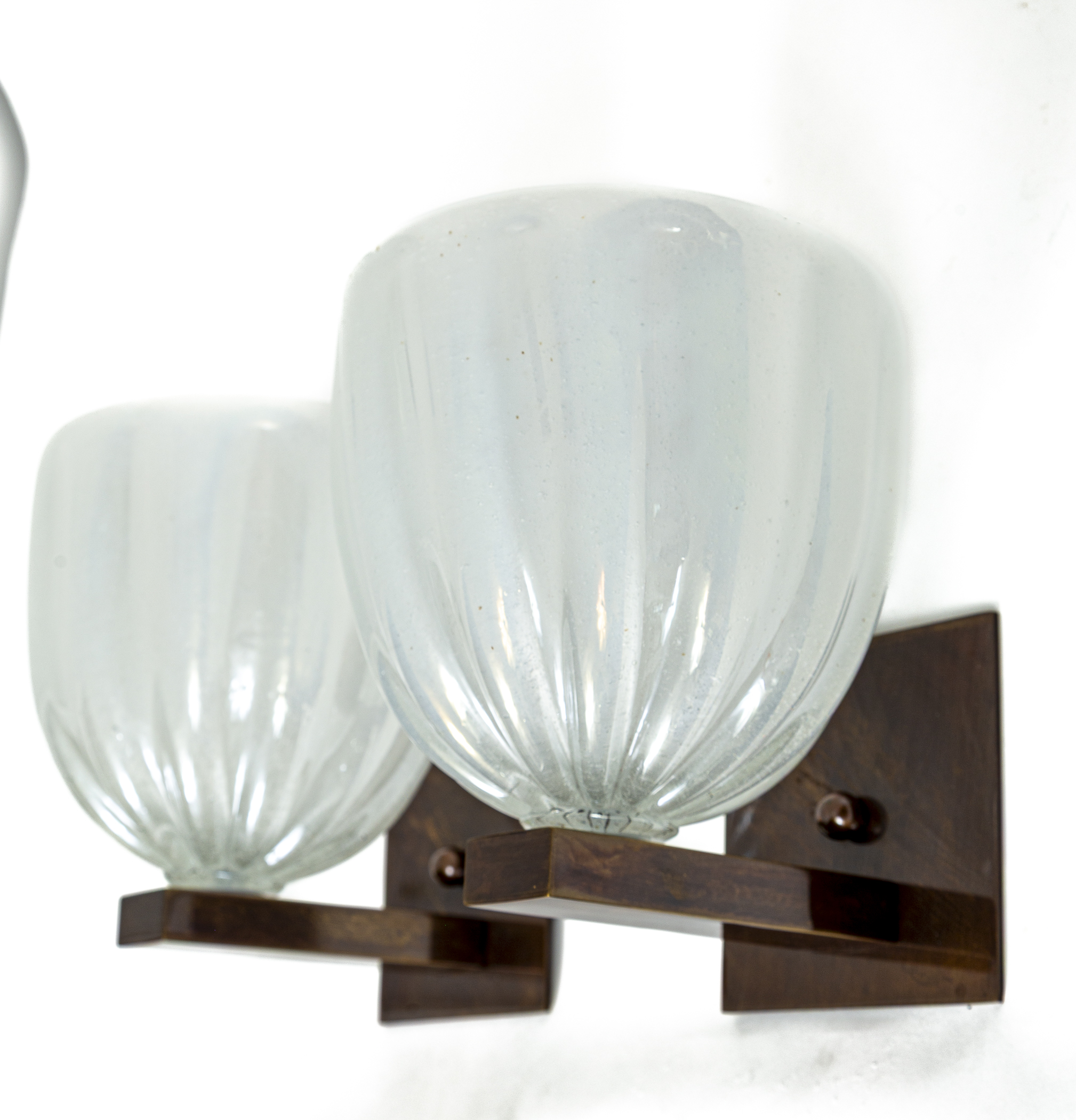 Pair of spectacular artisan blown opaline white round shaped wall lights upheld with sleek bronze patinated brass arm supports. Glass blown thickly in opaline to create a soft and dramatic illumination effect.