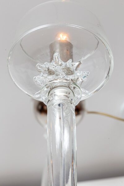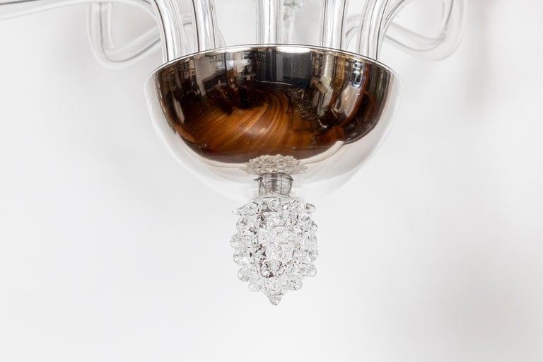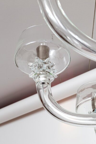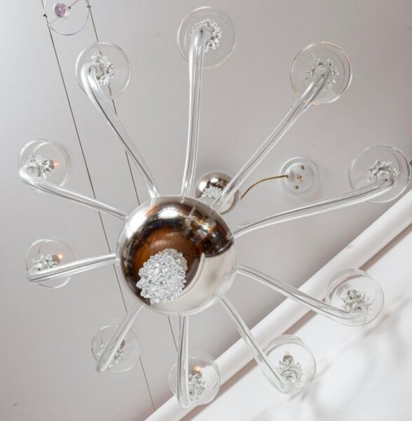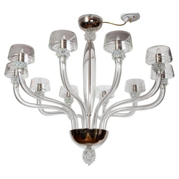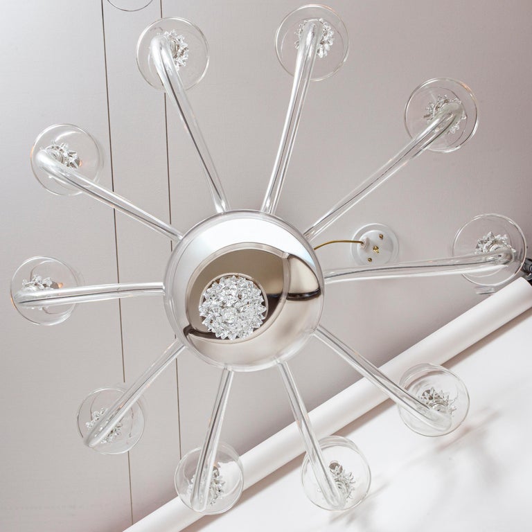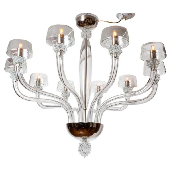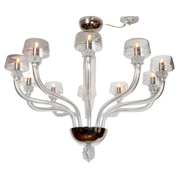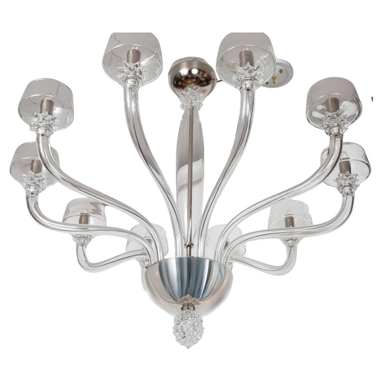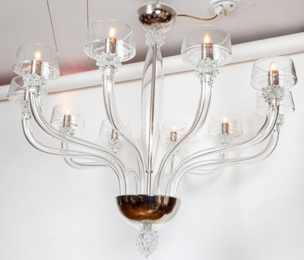 A modern and sleek mouth blown transparent glass chandelier with ten up-reaching arms terminating with rostrato fittings holding deep angled bobeches in which the bulbs are placed to illuminate the interior of the bobeche. The fixtures centershaft consisting of a glass canopy, a rostrato fitting and long arched center column is engineered to install directly to the ceiling but we can add chain and and additional canopy should more length is required or you may special order one to your exact specifications.