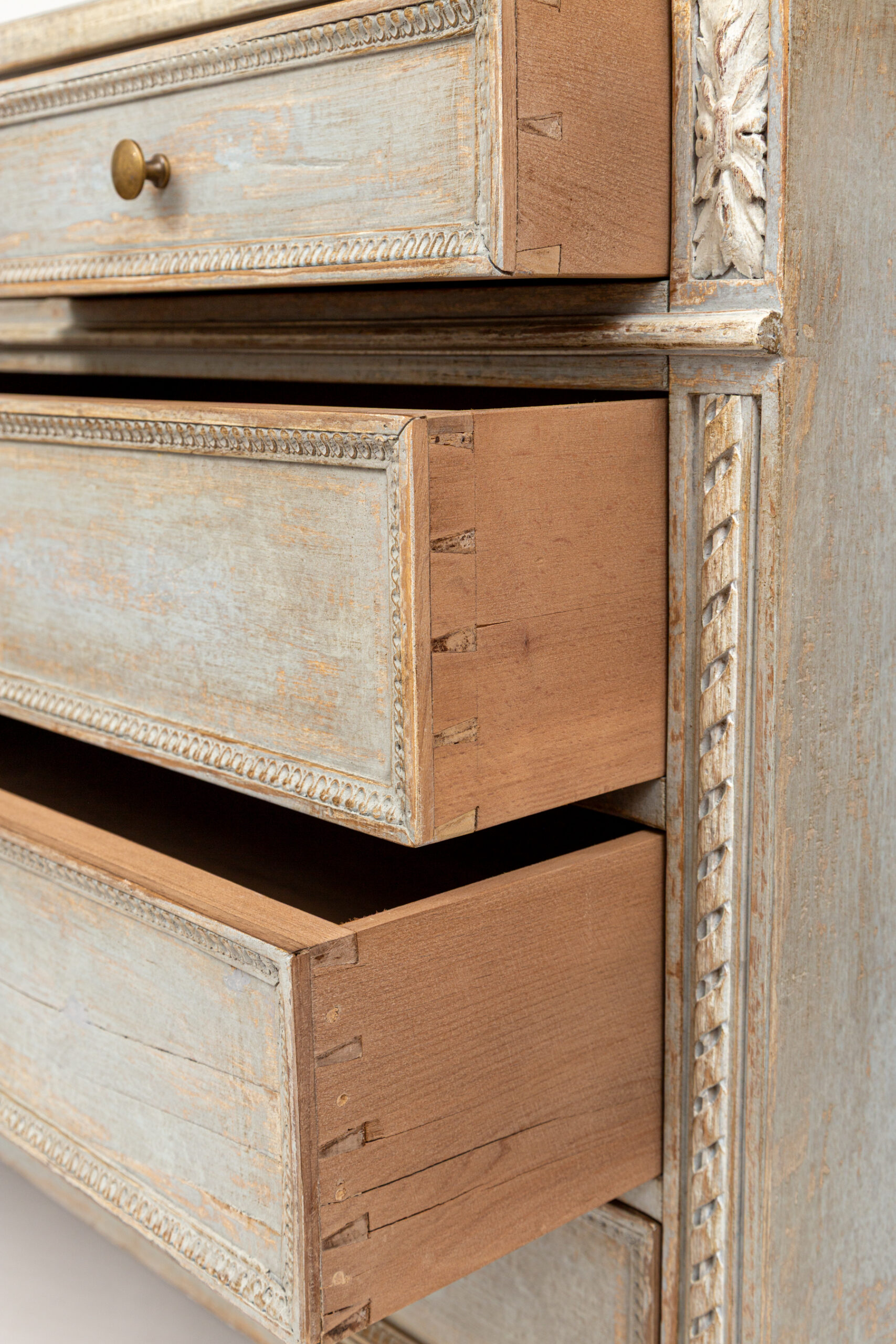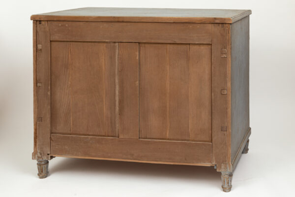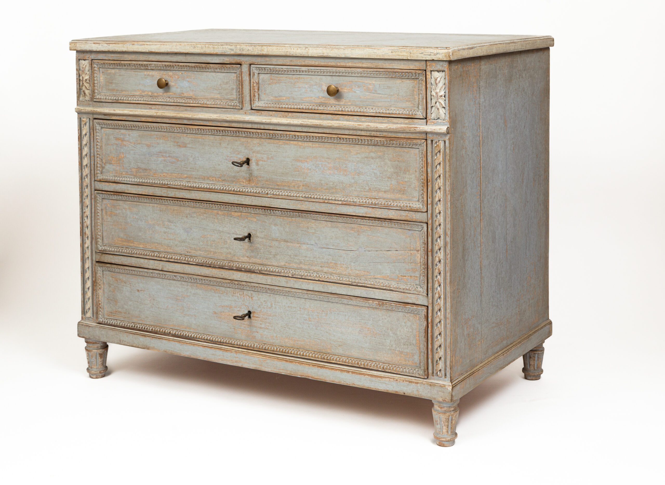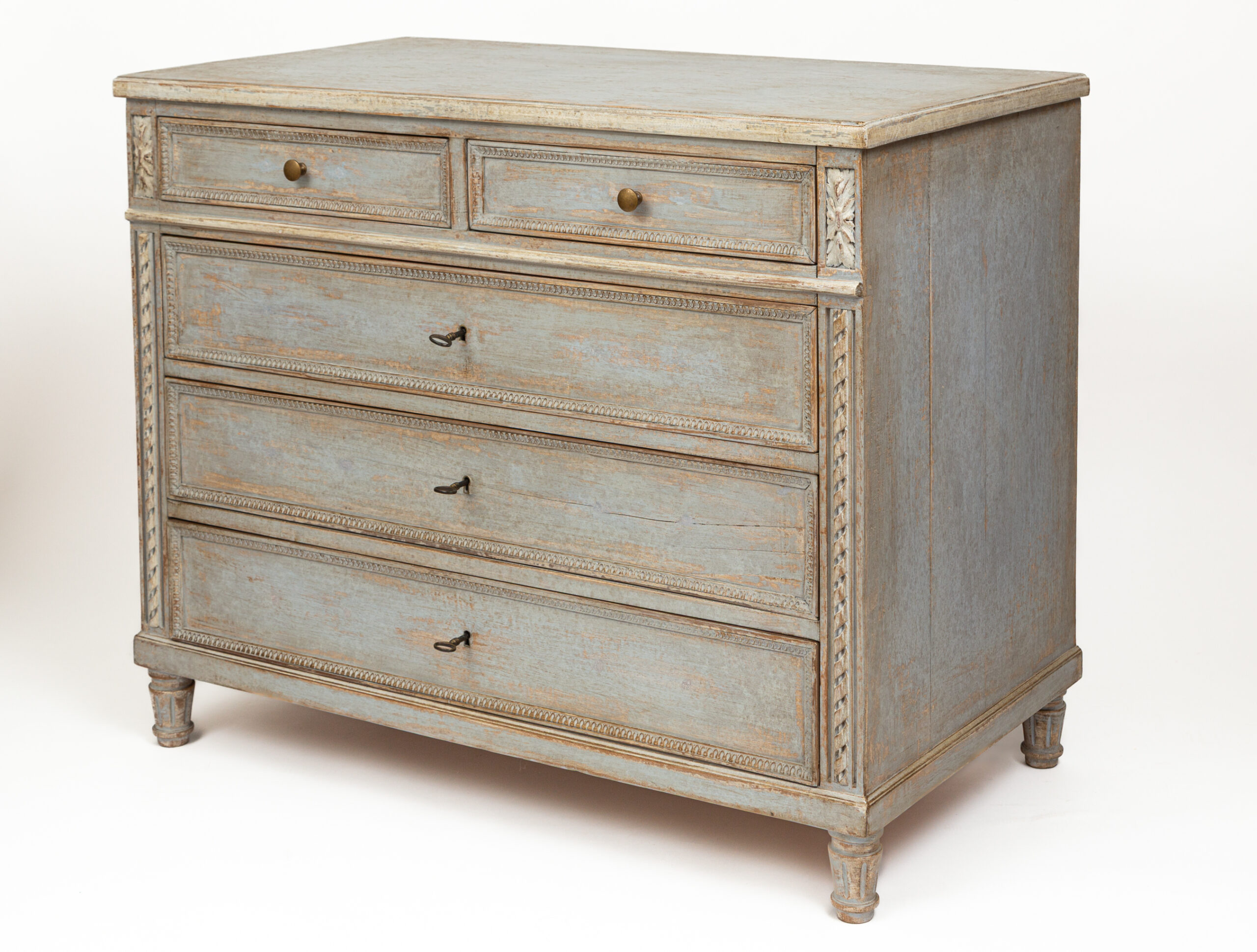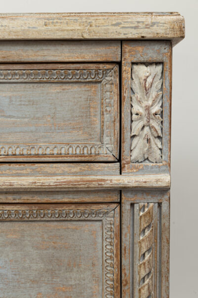 A unique sized ‘au milieu’ Neoclassical chest of drawers painted in crème greige tones over oak and made approximately 50 years ago. Delicate rope and cartouche carvings adorn this five drawer chest and finished on short tapered and rounded legs. Each drawer opens with their own key as pulls.