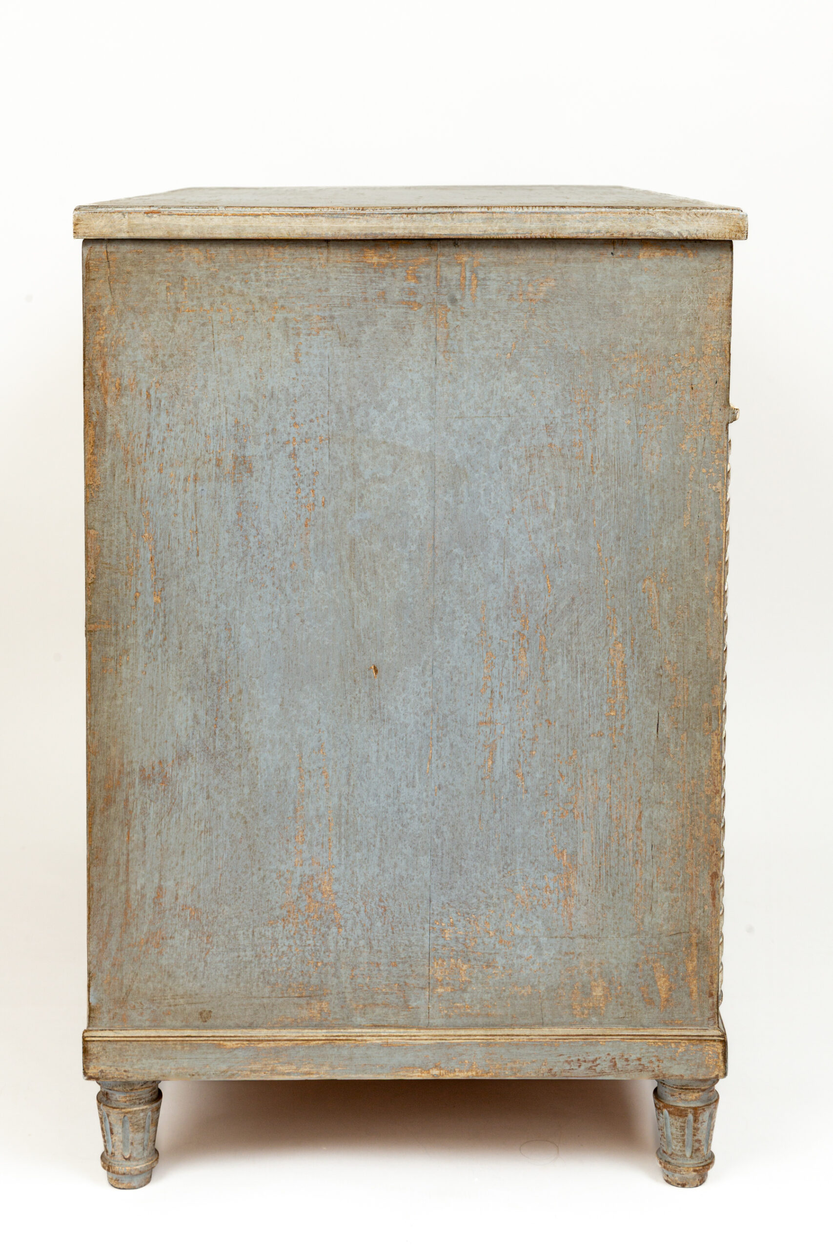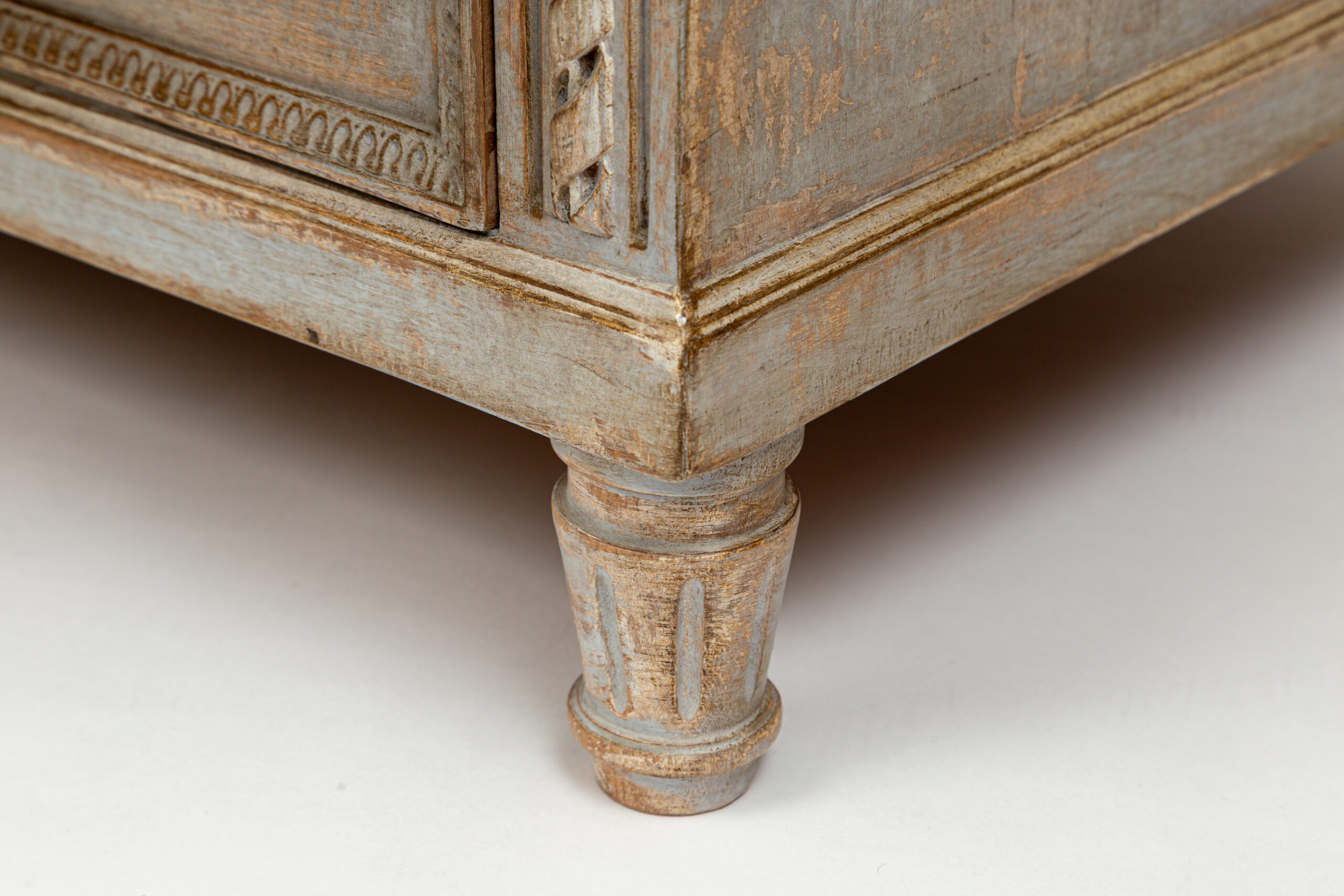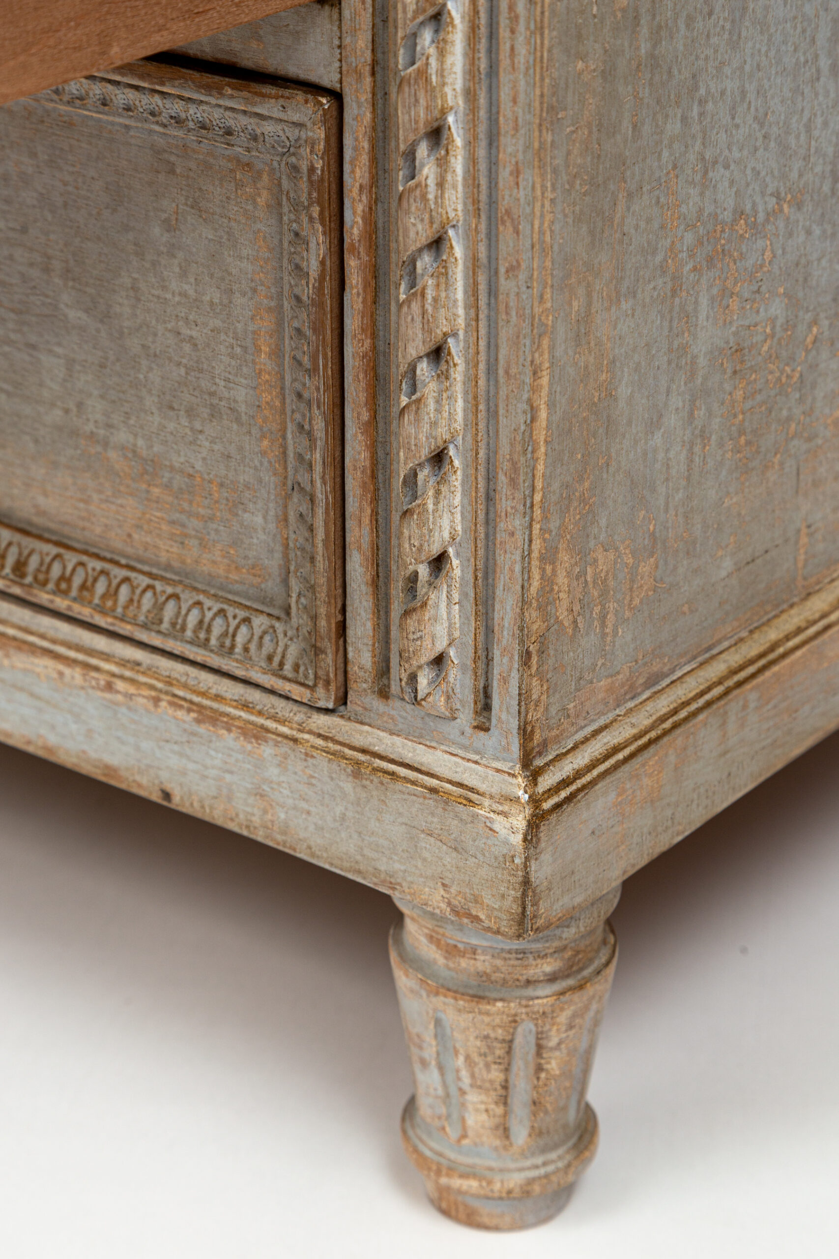 A unique sized ‘au milieu’ Neoclassical chest of drawers painted in crème greige tones over oak and made approximately 50 years ago. Delicate rope and cartouche carvings adorn this five drawer chest and finished on short tapered and rounded legs. Each drawer opens with their own key as pulls.
